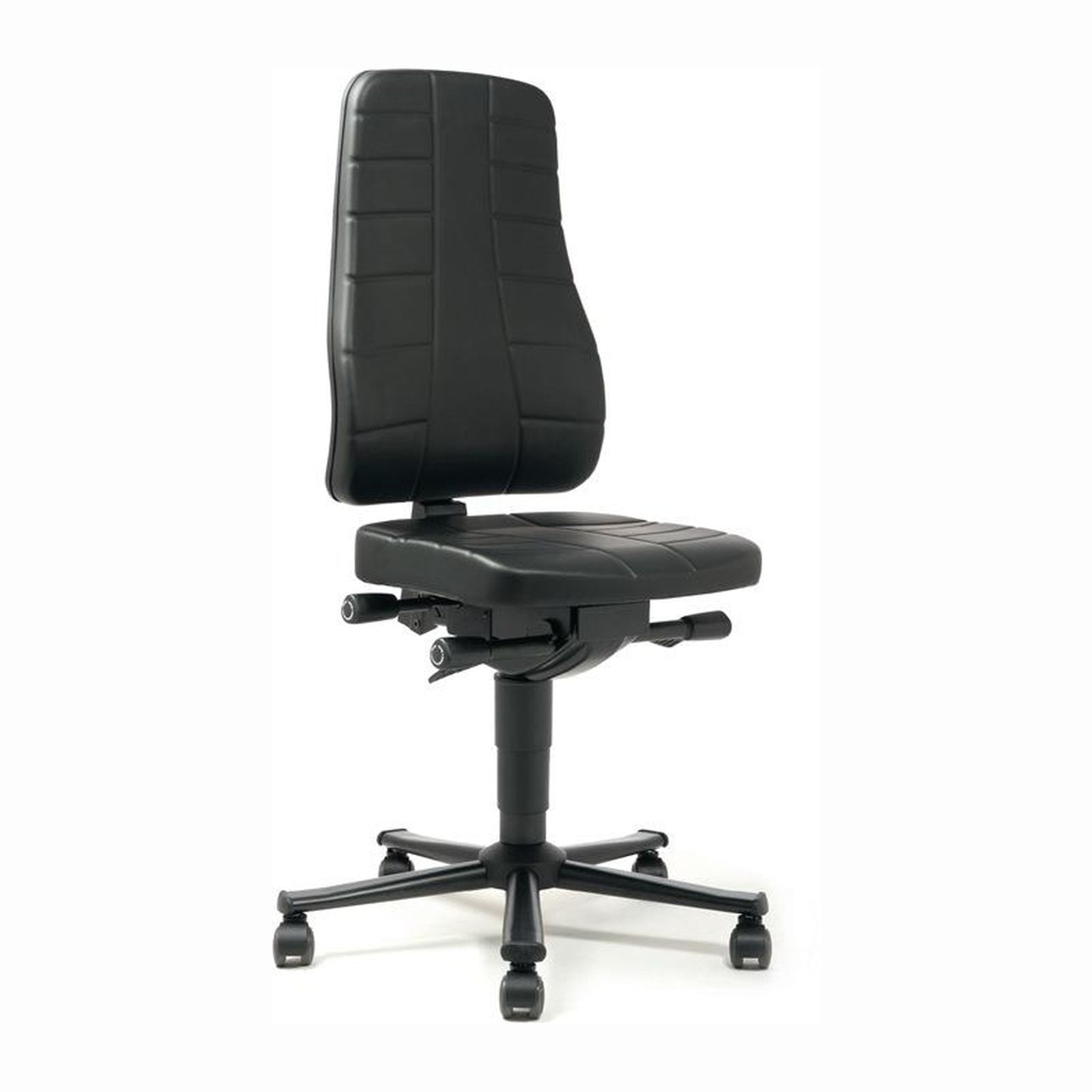 nach DIN 68877 bedienungsfreundliche Gasfeder-Sitzhöhenverstellung ergonomisch geformte Sitzfläche und Rückenlehne (extrahoch 600mm) Synchronmechanik mit Gewichtsregulierung Sitz in Neigung, Höhe und Tiefe verstellbar Neigungs- und höhenverstellbare Rückenlehne Sitz und Rückenlehne Polster mit robustem, fein strukturiertem, schwarzem Kunstlederbezug , leicht abwaschbar Untergestell mit lastabhängig gebremsten Sicherheits-Doppelrollen für harte Böden