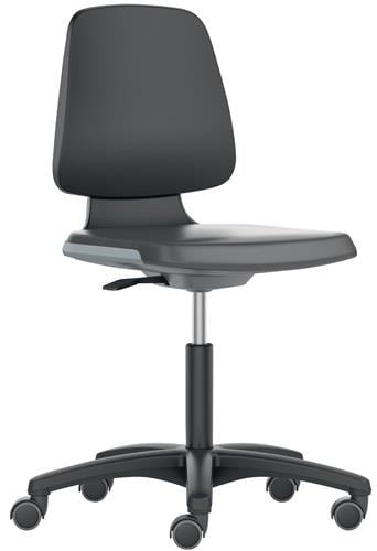 nach DIN 68877 bedienungsfreundliche Gasfeder-Sitzhöhenverstellung ergonomisch geformter Sitz und Rückenlehne aus Kunststoff Sitz mit robustem Integralschaumpolster beständig gegen leichte Säuren und Laugen, leicht abwaschbar Rückenlehne mit 3D-Flexfunktion passt sich den Bewegungen des Nutzers an Fünffuß-Untergestell aus Kunststoff, flach auslaufend, kipp- und stolpersicher Untergestell mit lastabhängig gebremsten Sicherheits-Doppelrollen für harte Böden Ausführung: Sitzschale anthrazit Gestellausführung: Rollen Sitz/Rückenlehne: Integralschaum Polsterfarbe: schwarz Sitzhöhenverstellung: 450-650 mm Marke: BIMOS