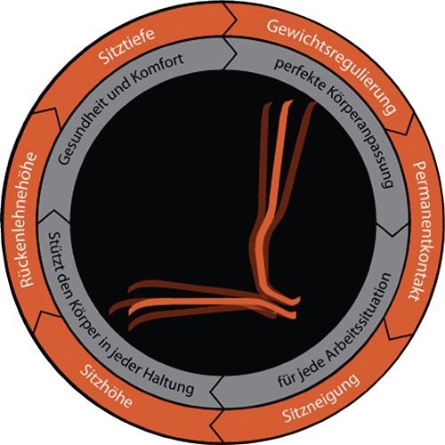 nach DIN 68877 bedienungsfreundliche Gasfeder-Sitzhöhenverstellung ergonomisch geformte Sitzfläche und Rückenlehne mit Wechselpolstersystem (Zubehör) Permanentkontakt-Rückenlehne Sitz in Neigung, Höhe und Tiefe verstellbar höhenverstellbare Rückenlehne Untergestell mit stabilem Aluminium-Fußkreuz, abriebfesten Kunststoff-Bodengleitern und höhenverstellbarem Fußring für erhöhte Sitzposition Stuhl kann nur in Verbindung mit einem Wechselpolstersystem eingesetzt werden