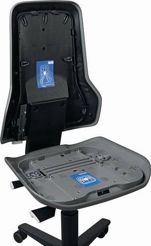 nach DIN 68877 bedienungsfreundliche Gasfeder-Sitzhöhenverstellung ergonomisch geformte Sitzfläche und Rückenlehne mit Wechselpolstersystem (Zubehör) Permanentkontakt-Rückenlehne Sitz in Neigung, Höhe und Tiefe verstellbar höhenverstellbare Rückenlehne Untergestell mit stabilem Aluminium-Fußkreuz und lastabhängig gebremsten Sicherheits-Doppelrollen für harte Böden Stuhl kann nur in Vebindung mit einem Wechselpolster eingesetzt werden