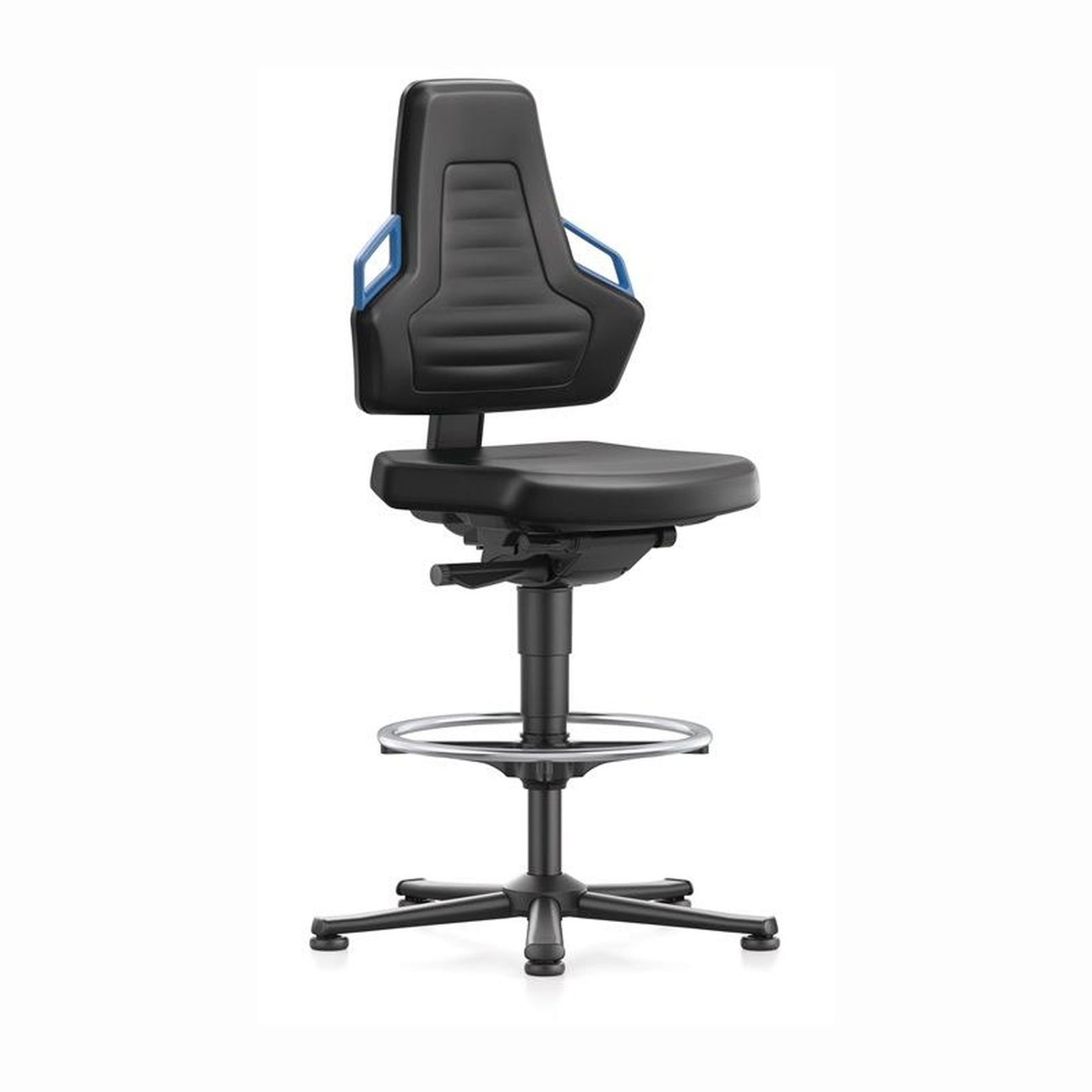 Merkmale Grifffarbe: blau Ausführung: Synchrontechnik Gestellausführung: Bodengleiter + Fußring Sitz/Rückenlehne: Kunstlederpolster Polsterfarbe: schwarz Sitzhöhenverstellung: 570-820 mm Marke: BIMOS