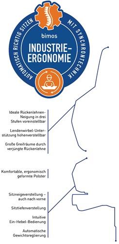 nach DIN 68877 bedienungsfreundliche Gasfeder-Höhenverstellung intuitive Ein-Hebel-Bedienung ergonomisch geformter Sitz- und Rückenlehne Synchrontechnik mit automatischer Gewichtsregulierung inkl. manueller Feinjustierung Voreinstellung des Bewegungsspektrums der Rückenlehne in drei Stufen, Sitzneige- und Sitztiefenverstellung, Rückenlehnen-Höhenverstellung praktische Funktionsgriffe Lendenwirbel-Unterstützung höhenverstellbar Fünffuß-Untergestell aus stabilem Stahlrohr, flach auslaufend, kipp- und stolpersicher