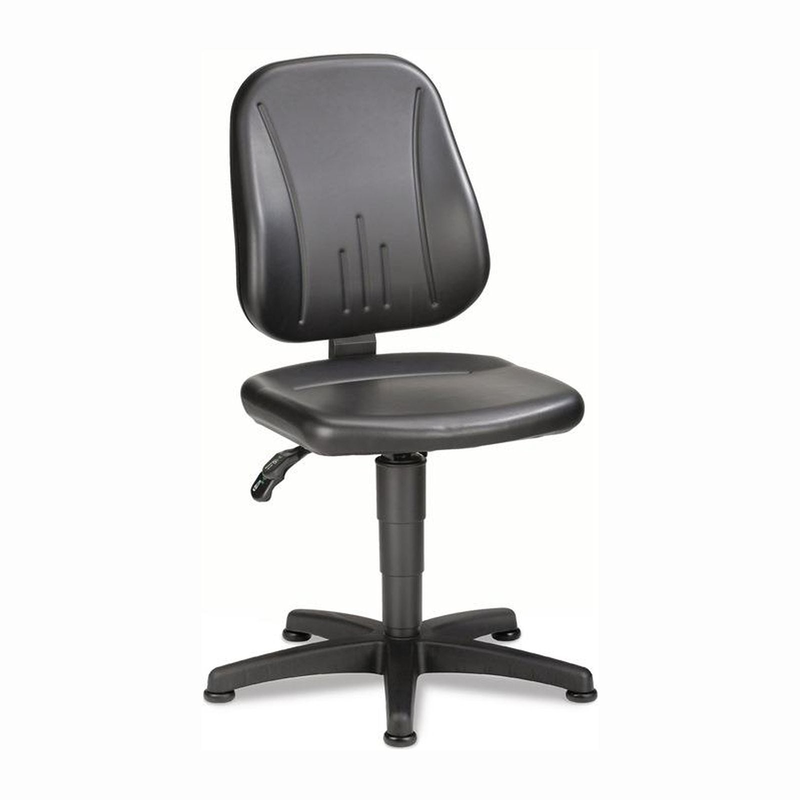 nach DIN 68877 bedienungsfreundliche Gasfeder-Sitzhöhenverstellung ergonomisch geformte Sitzfläche und Rückenlehne mit robustem feinstrukturierten Kunstlederbezug , leicht abwaschbar Rückenlehnen pendelnd gelagert mit stufenloser Neigungsverstellung und 10-facher Höhenverstellung Fünffuß-Untergestell aus Kunststoff, flach auslaufend, kipp- und stolpersicher Untergestell mit abriebfesten Kunststoff-Bodengleitern