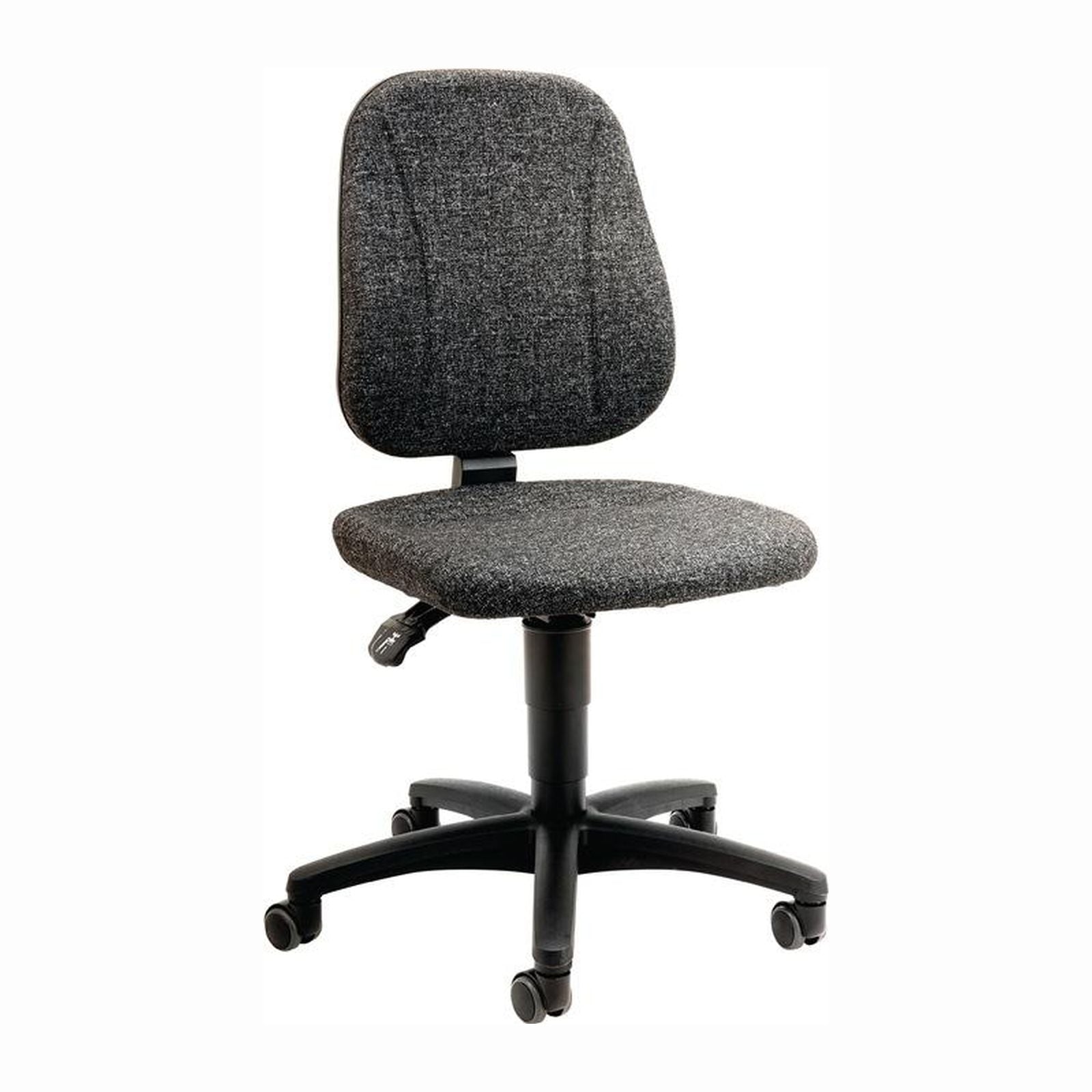 nach DIN 68877 bedienungsfreundliche Gasfeder-Sitzhöhenverstellung ergonomisch geformte Sitzfläche und Rückenlehne mit weichem, atmungsaktivem Stoffpolster, anthrazit meliert Rückenlehnen pendelnd gelagert mit stufenloser Neigungsverstellung und 10-facher Höhenverstellung Fünffuß-Untergestell aus Kunststoff, flach auslaufend, kipp- und stolpersicher Untergestell mit lastabhängig gebremsten Sicherheits-Doppelrollen für harte Böden