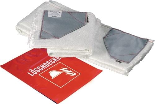 aus E-Glasgewebe mit zwei grauen Griftaschen verpackt in rotem Beutel mit Halbmond-Symbol Schnittkanten gesäumt Löschdecke nach DIN EN 1869