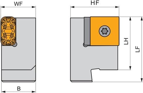 Modular Drehsystem mit Knieheblklemmung zum spannen von Rechteckig negative Wendeschneidplatten mit einer Hauptschneidenlänge von 30mm (ISO Bezeichnung LN.X 3019.. ) · für die Radsatzbearbeitung · zur Montage mit DKTR 5055 X (A1/A2) für Kegeldrehen und Längsdrehen ohne Schulter Weitere technische Eigenschaften: · Bruttogewicht: 228g · Fräserdesign: KTP-LAN(RL) · Funktionsbreite - Metrisch: 23mm · Funktionshöhe - Metrisch: 32mm · Funktionslänge - Metrisch: 43mm · Klemmtypcode: P - Lochklemmung · Kopflänge - Metrisch: 35mm · Nettogewicht: 170g · Orthogonaler Spanwinkel: 0Grad · Schaftbreite - Metrisch: 22,6mm · Schneidrichtung: Rechts
