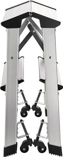 fahrbar aus stabilem Aluminium, zusammenklappbar durch die 4 Gleitrollen frei beweglich (360°) Klapptritt senkt sich bei Belastung unverrückbar und bietet sicheren Stand alle Kanten durch Kunststoffkappen geschützt max. Gesamtbelastung 150 kg