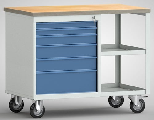 - 1x KLW-LUTZ BETRIEBSEINRICHTUNGEN Werkbank PW700 B885xT700xH805mm Buche Multipl. lichtgrau/brillantblau 6Schubl.