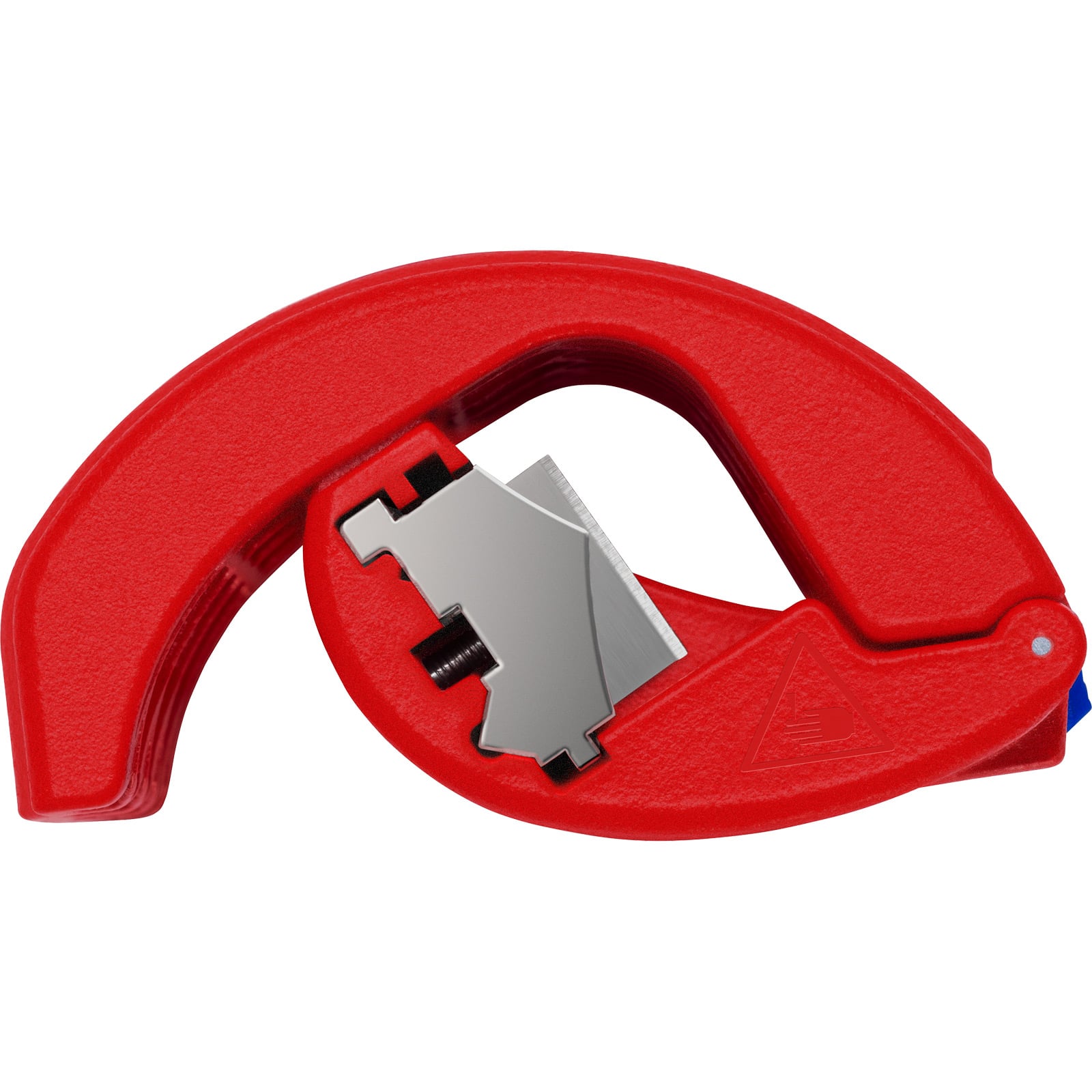 Besonders pfiffiger Rohrschneider: trennt Rohre spanlos und passt in die Faust. Schneidet u.a. Hochtemperatur-Abwasserrohre und Elektro-Leerrohre im Handumdrehen. Kürzt Tropf- und Dichthülsen bei der Endmontage –normgerecht nahe der Wand. Schneidet unverstärkte Kunststoffrohre von Ø 20 bis 50 mm mit Wandstärken bis 2,4 mm. Schneidet weiche Kunststoffrohre und solche mit geschäumten Kernen von Ø 20 bis 50 mm mit Wandstärken bis 3,5 mm. Schneidet Tropf-und Dichthülsen mit ca. 2-3 mm Wandabstand. Trennt Rohre sauber und spanlos in wenigen Umdrehungen. Drehbarer Messerblock zum Schneiden von Kunststoffrohren (Klinge mittig) oder Tropf- und Dichthülsen (Klinge außen). Mit Verschlussmechanismus zum sicheren Transport. Zwei Ersatzklingen im Werkzeug integriert.