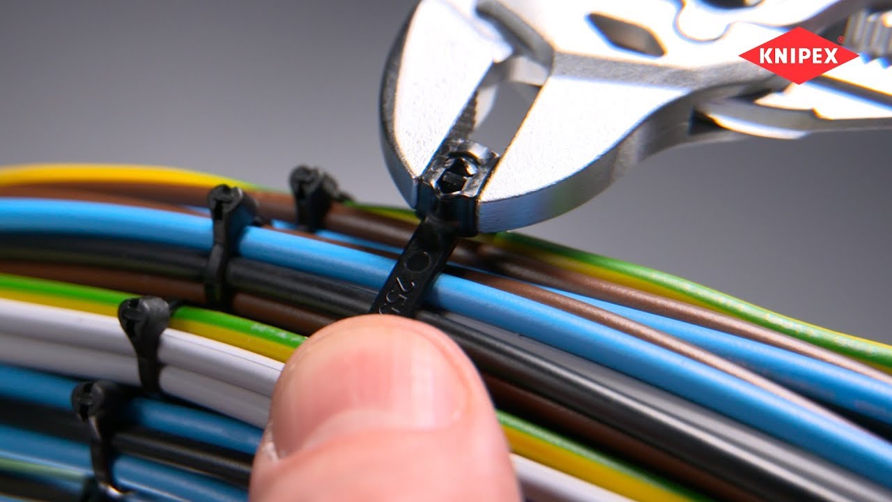 - Zangenschlüssel mit spezieller Laser-Scharierrung für guten Halt: den Kopf des Kabelbinders greifen, zusammenpressen, lösen – ganz ohne schneiden