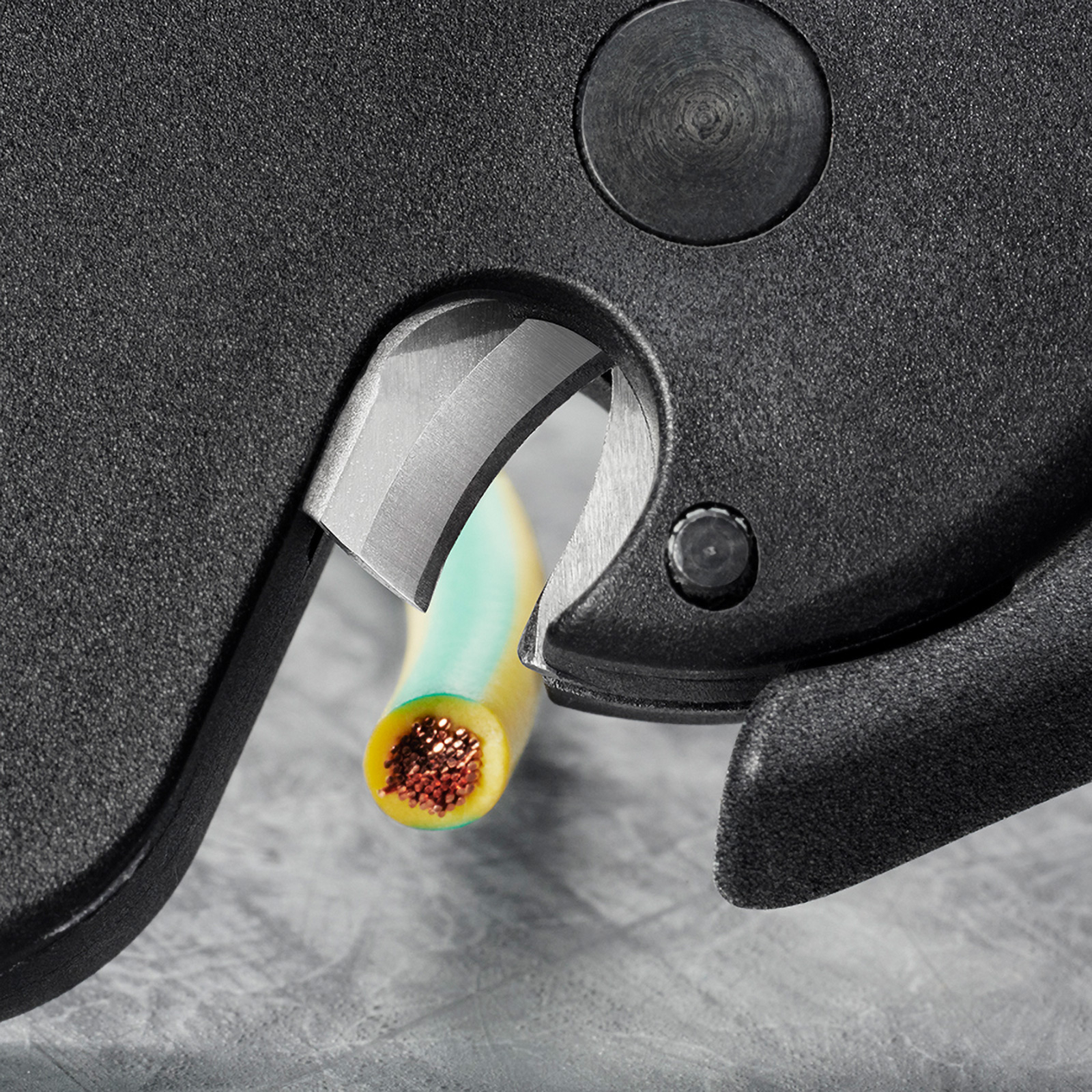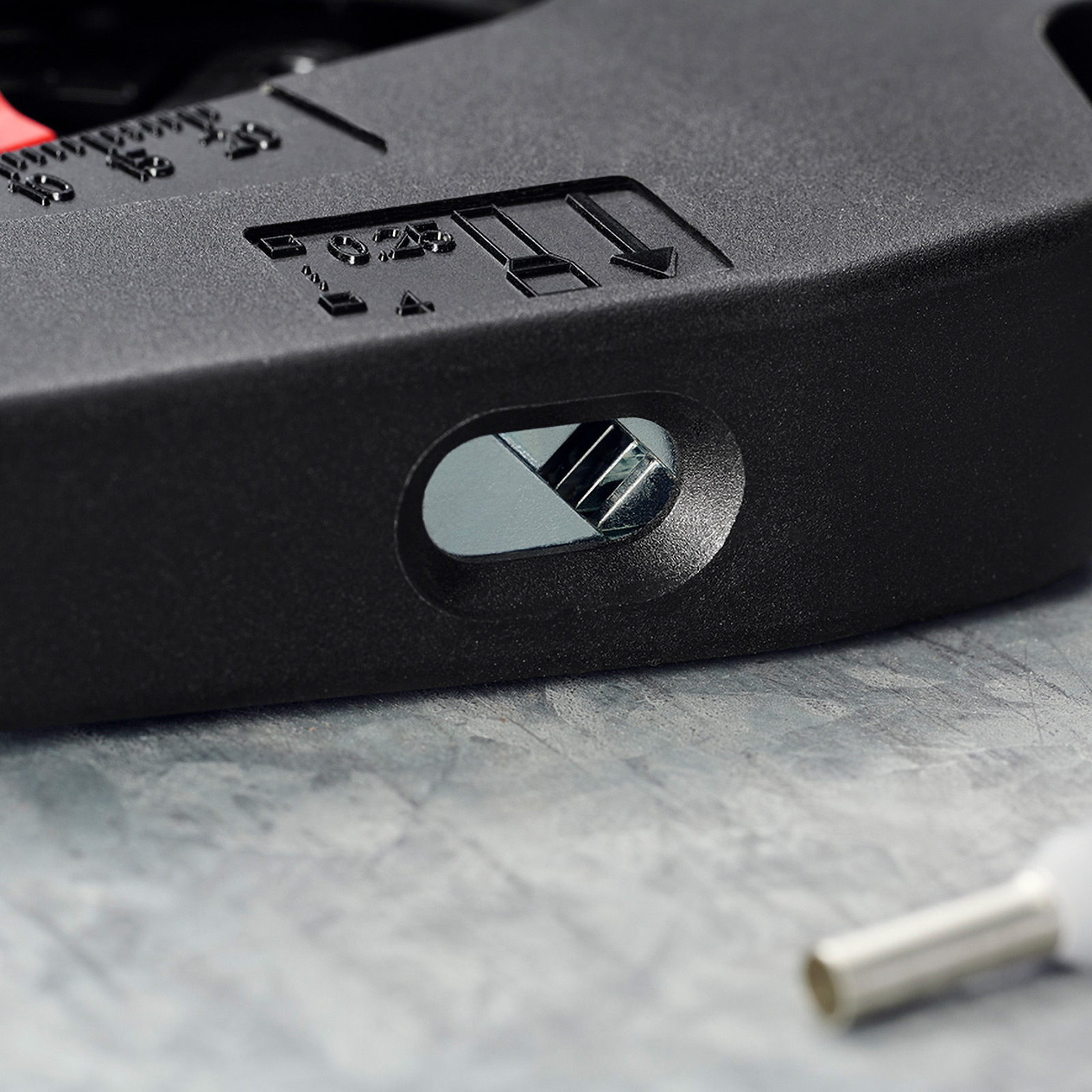 - Präzise abisolieren: automatische Größenanpassung mit Längenanschlag für exaktes, wiederholgenaues Arbeiten, mit Feinjustierung