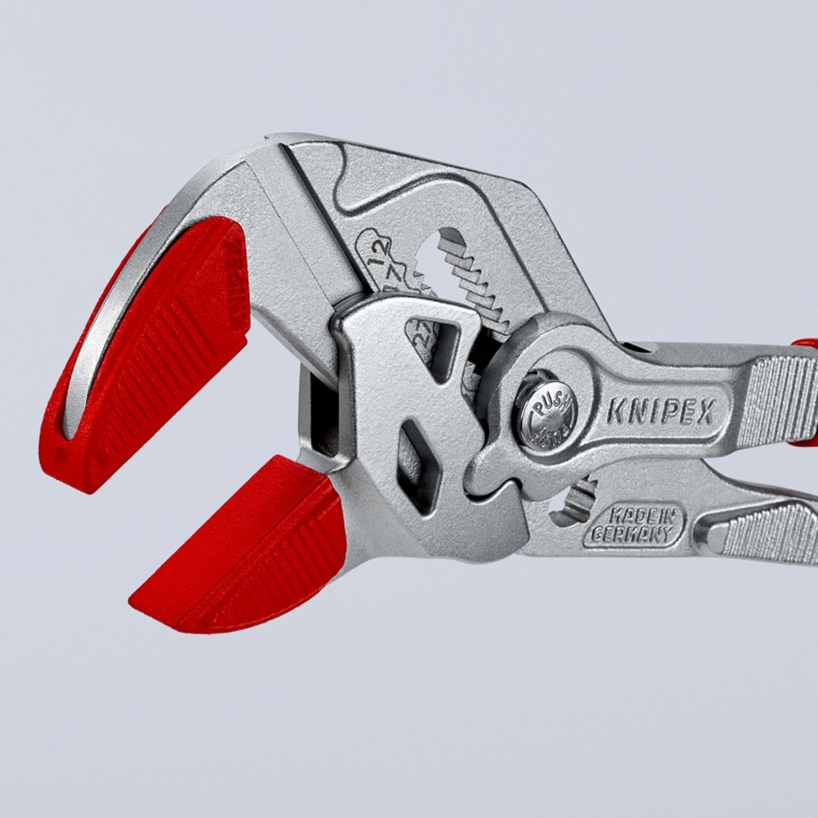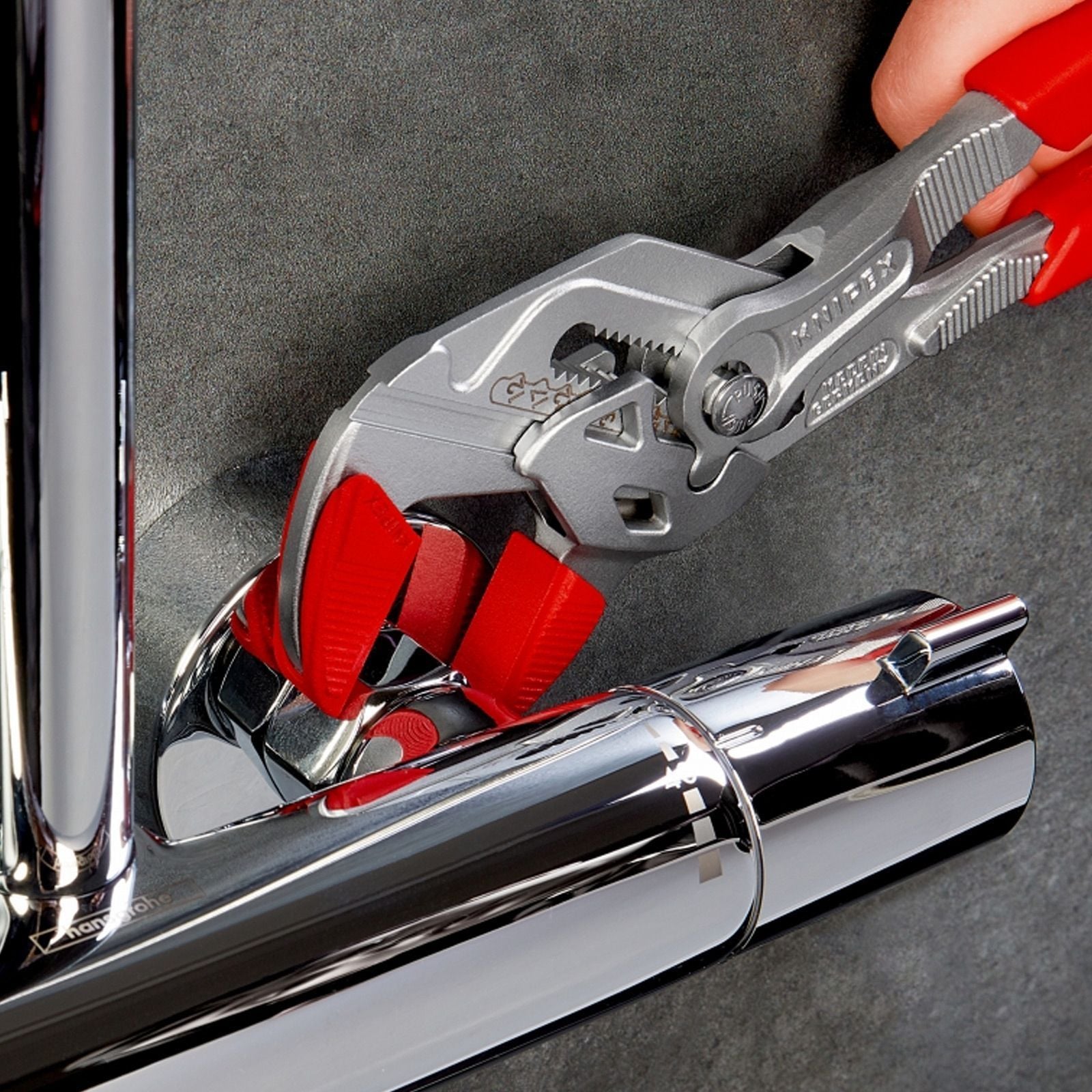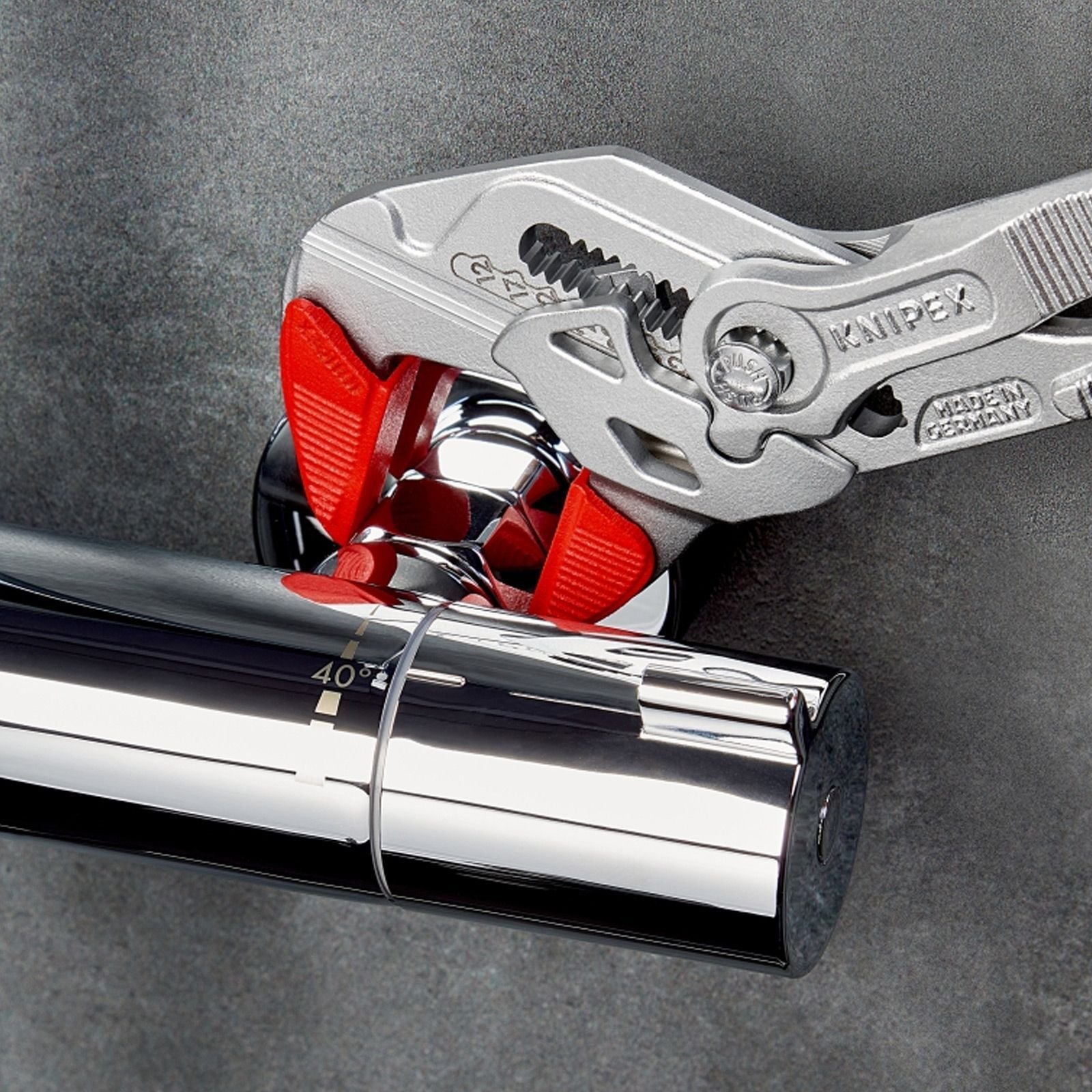 - Für den überarbeiteten Zangenschlüssel (Modell ab 2018) in der 250er-Länge: beschädigungsfreies Greifen, Halten und Pressen