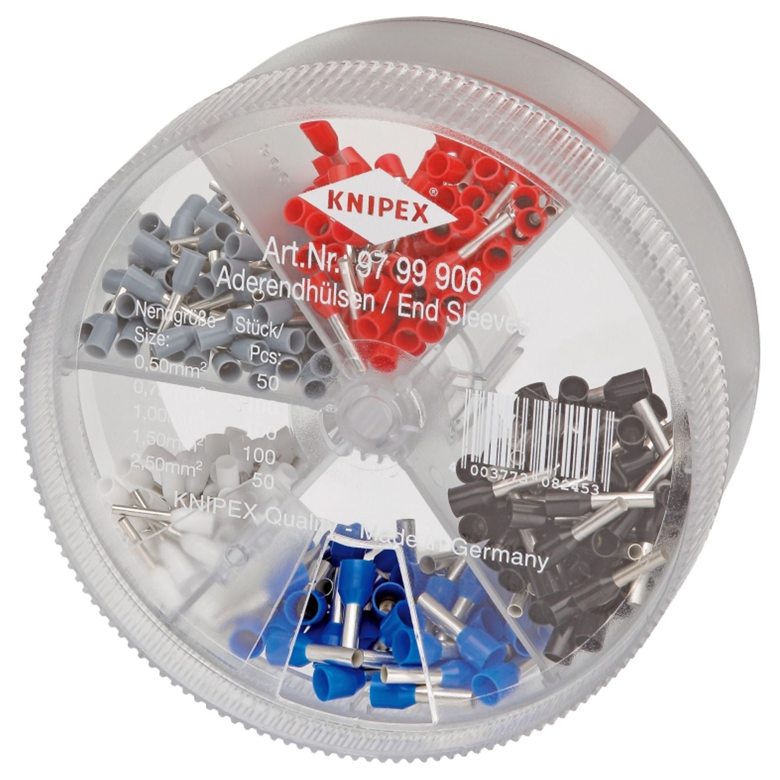 - Drehbarer Deckel mit Öffnung zur Entnahme einzelner Aderendhülsen