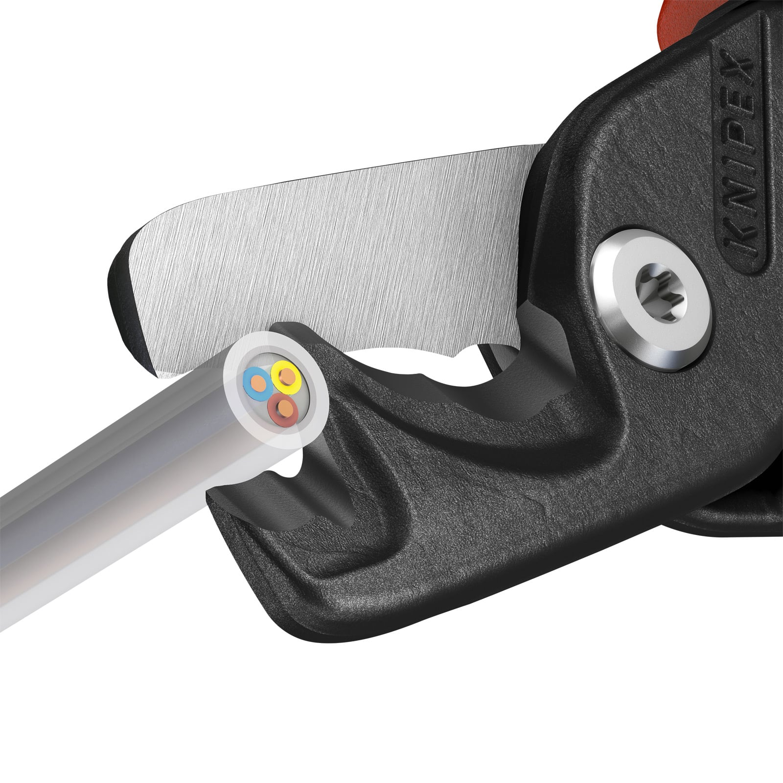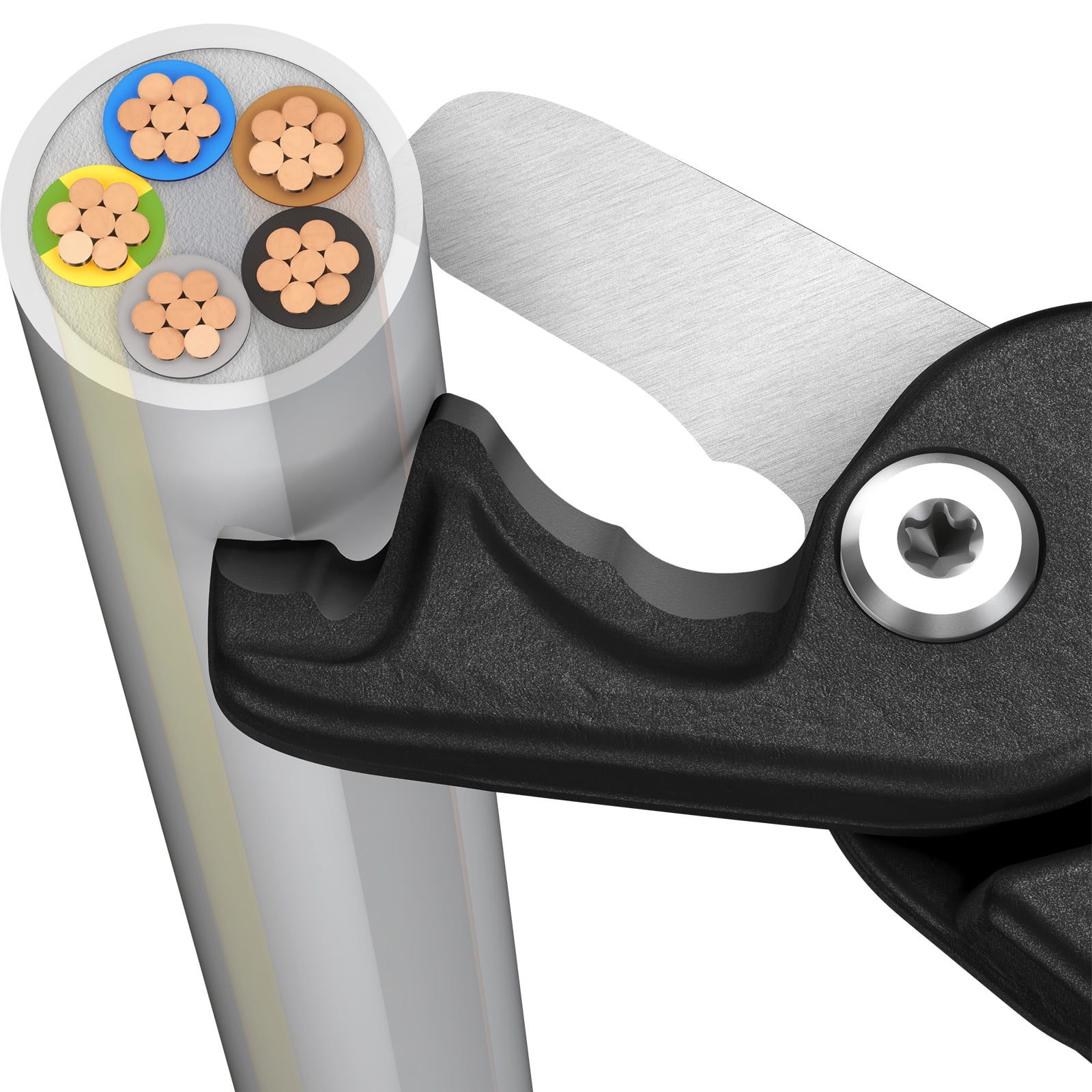 - Zwei Schneidbereiche: Die abgestufte Hauptschneide hält kleinere und größere Kabel beim Schnitt stets maximal gelenknah, die Frontschneide dient zum schrittweisen Trennen („Knabbern”) sehr großer Kabel.