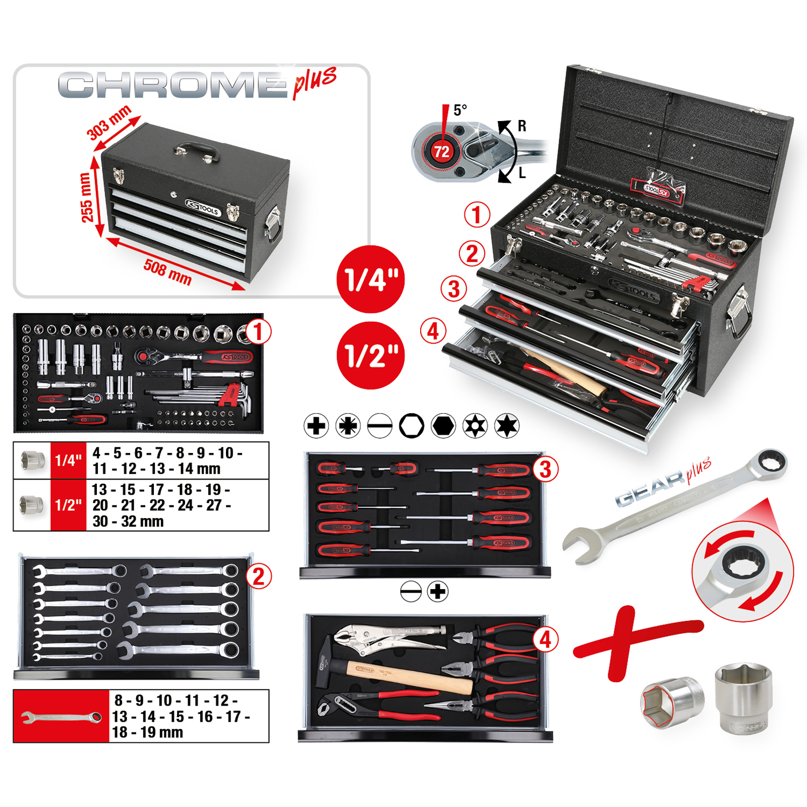 1x KS TOOLS 1/4"+1/2" CHROMEplus Universal-Werkzeug-Satz 99tlg. GEAR