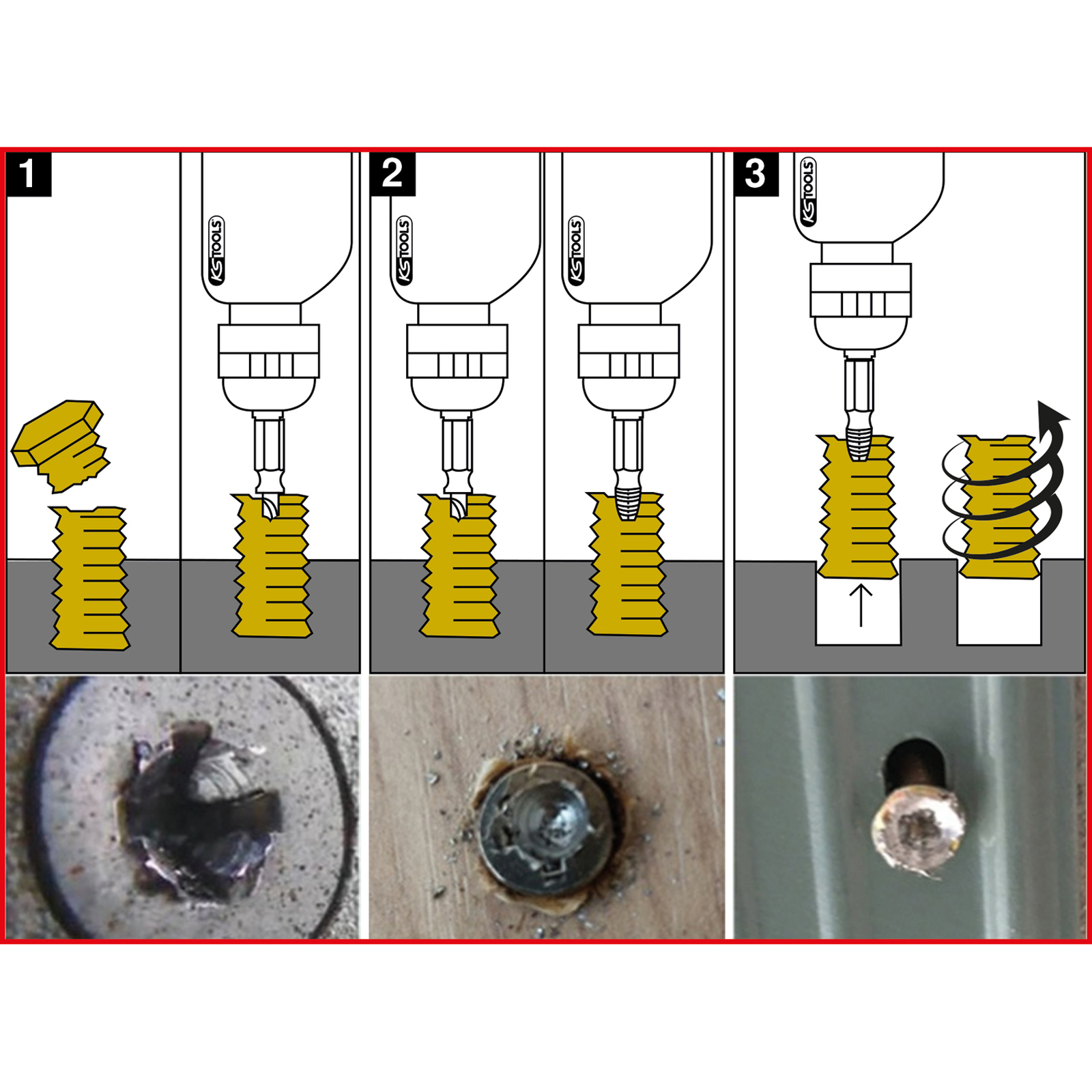 - spezielles, linksdrehendes Schneidgewinde mit konisch zulaufenden Schneiden für Torx-Schrauben und speziell geformte Ausdreher für Innensechskant-Schrauben