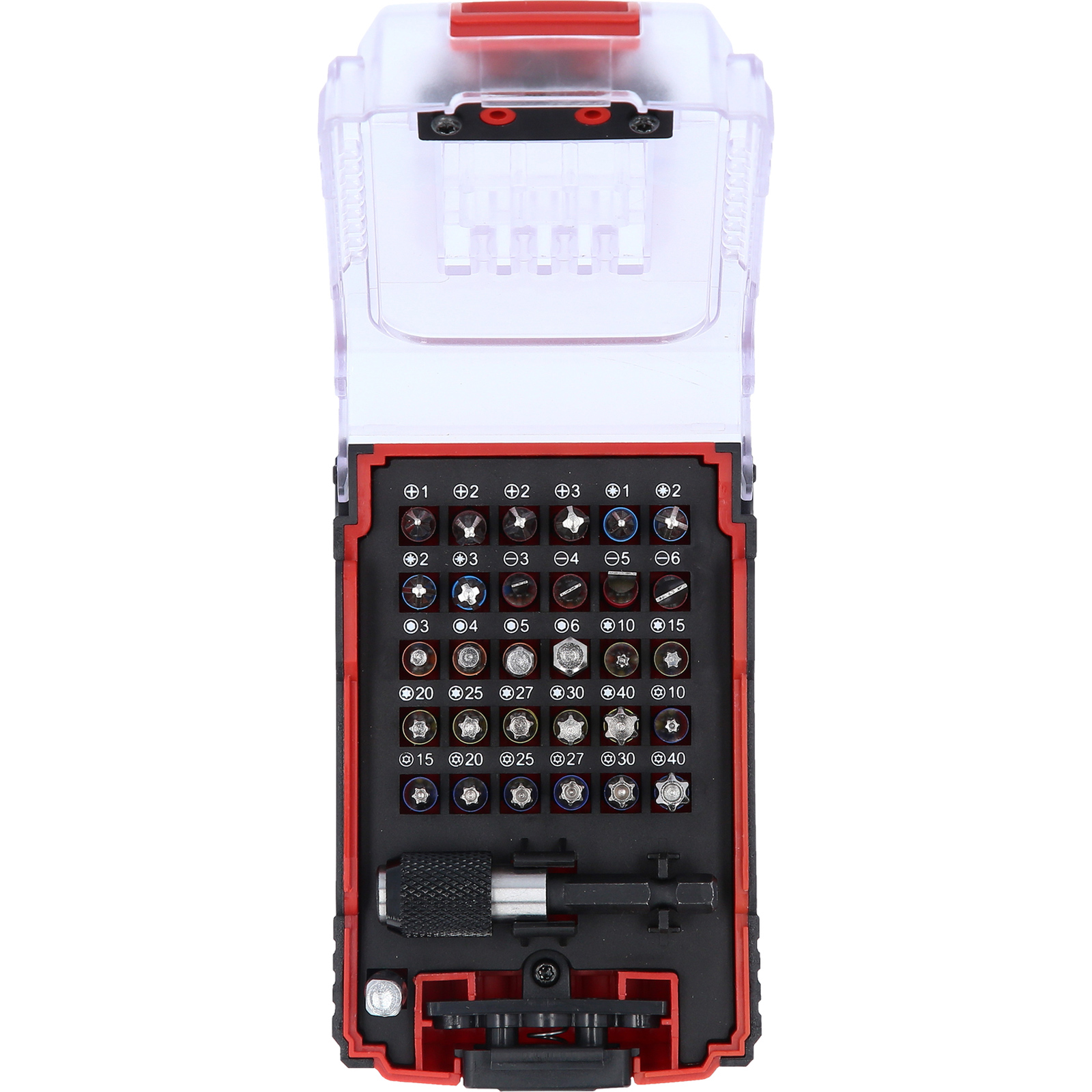 - präzise und ordentliche Anordnung der gängigsten 1/4" Bits