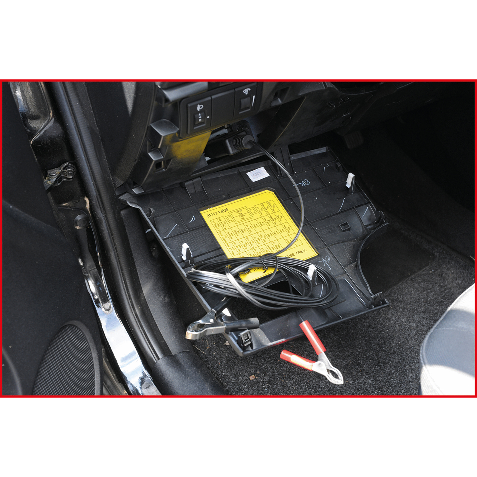 - Anschluss erfolgt über die OBD II-Buchse und Krokodilpolklemmen einer externen Batterie