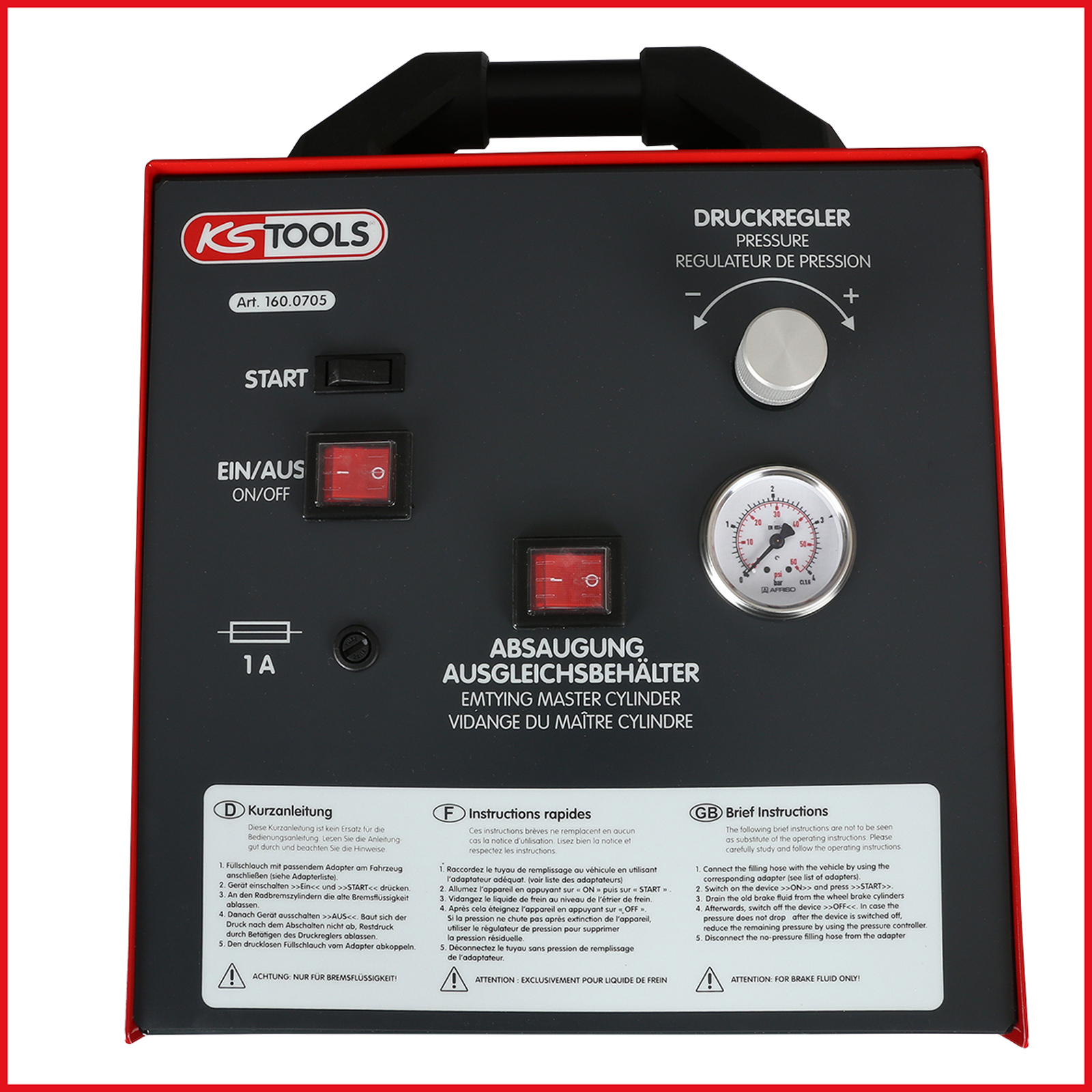 - integrierte Absaugung zum Entnehmen der alten Bremsflüssigkeit