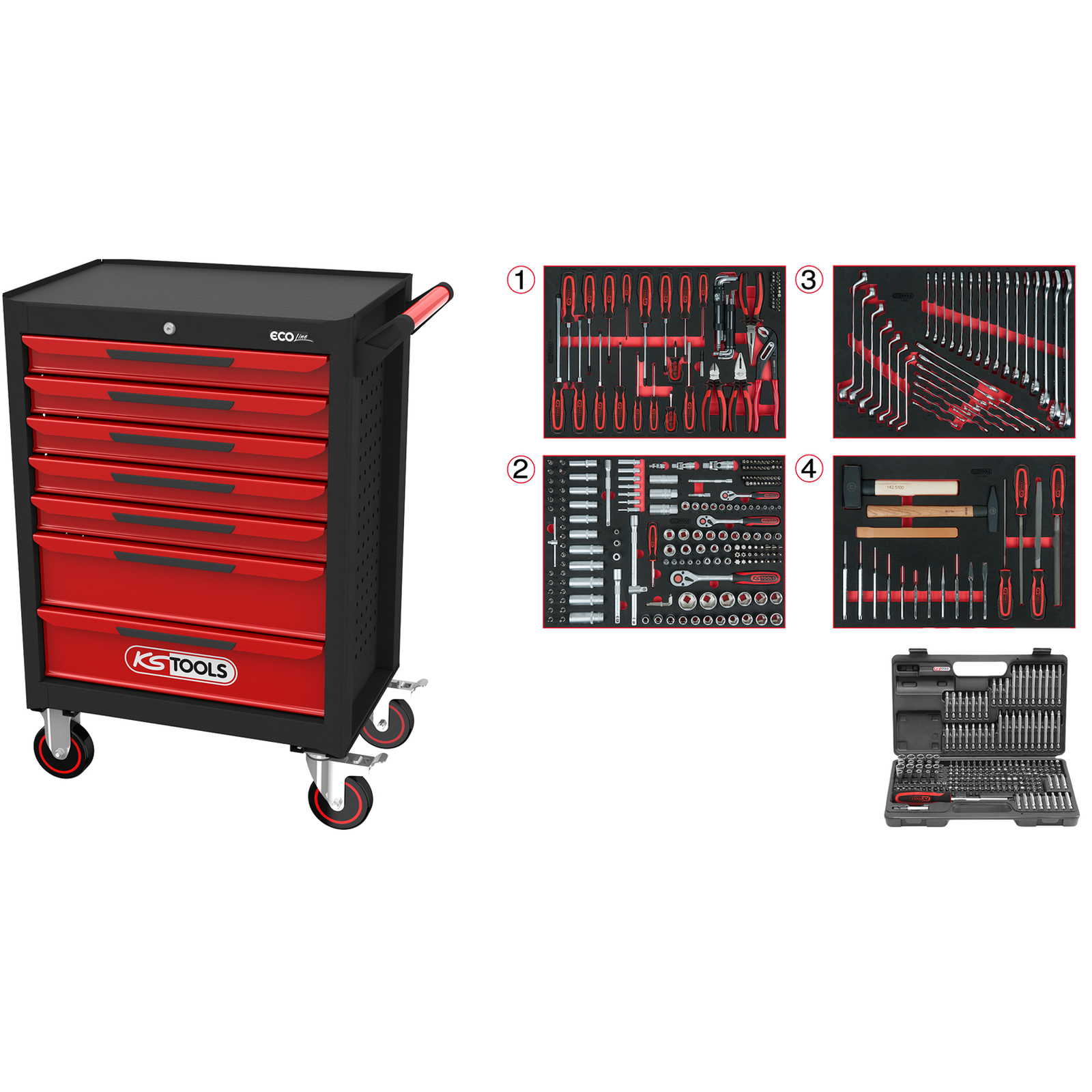 1x KS TOOLS ECOline SCHWARZ/ROT Werkstattwagen mit 7 Schubladen und 515 Premium-Werkzeugen