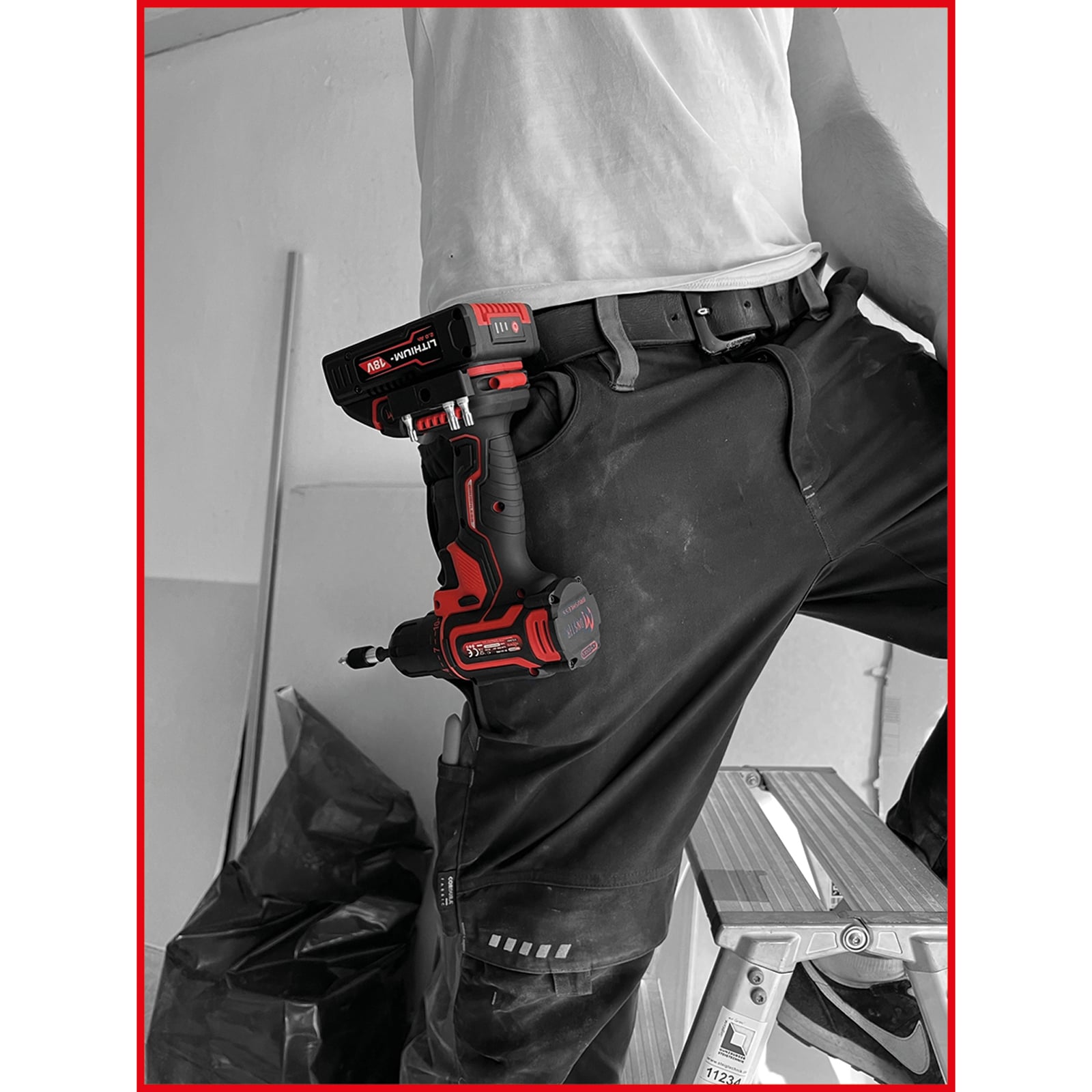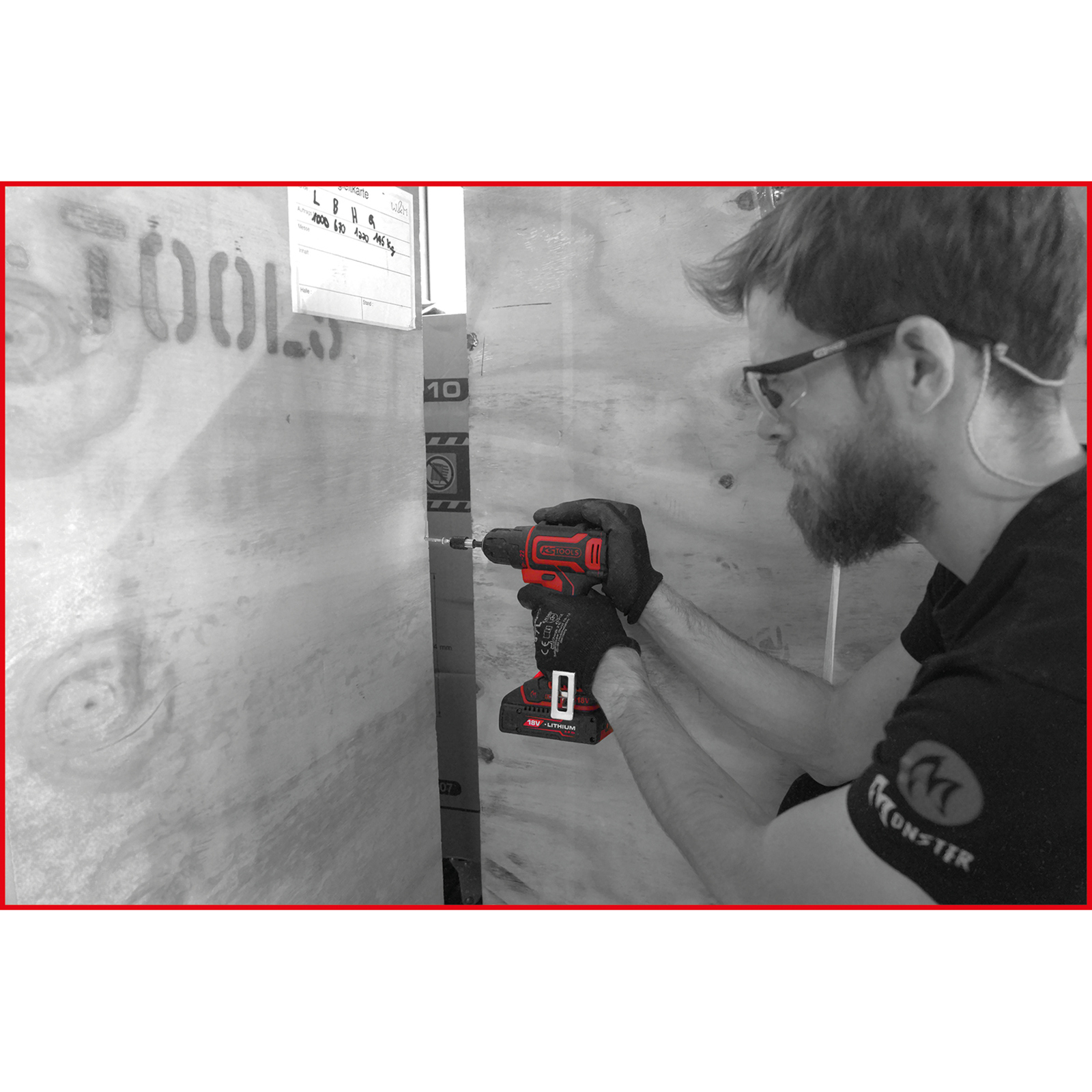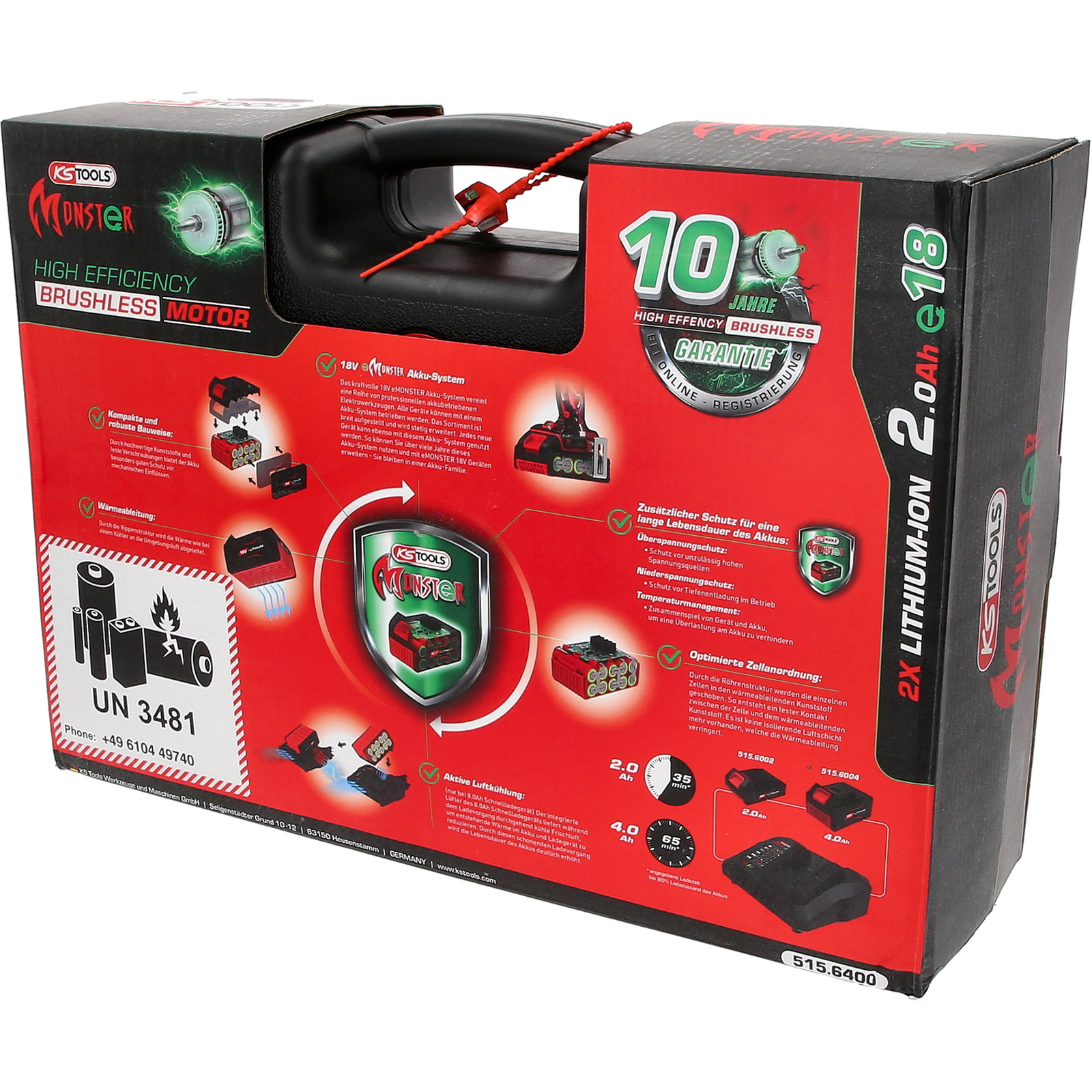 Der gesamte Satz wird in einem robusten Kunststoffkoffer geliefert, der eine sichere Aufbewahrung gewährleistet. Die Scharniere und Schnallen des Koffers sind aus Edelstahl gefertigt, um eine lange Haltbarkeit sicherzustellen. Der Koffer verfügt über ein freies Beschriftungsfeld für individuelle Kennzeichnungen, sowie Piktogramme zur verbesserten Übersichtlichkeit des Inhalts. Zusätzlich sind im Koffer bereits ein leerer Platz für einen zusätzlichen Akku, ein Platz für den passenden eMONSTER Bit-Satz und ein integriertes Kleinteilfach vorhanden, um eine geordnete Aufbewahrung kleiner Zubehörteile zu ermöglichen.