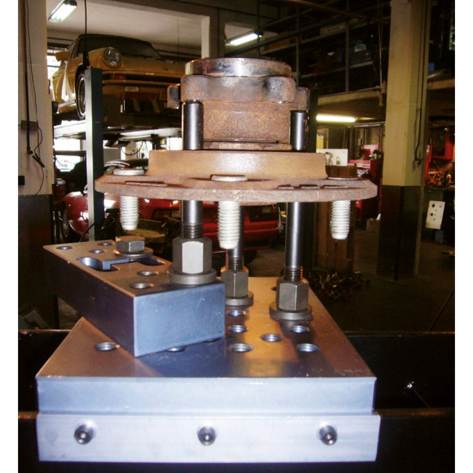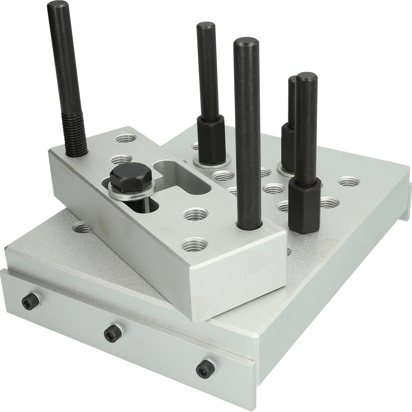 Die BRILLIANT TOOLS Pressunterlage BT676007 eignet sich hervorragend als Auflageplatte zur Verwendung an Werkstattpressen. Durch die höhenverstellbaren Bolzen wird eine spiel- und wackelsichere 3-Punkt Auflage geschaffen. Die Anzahl und Anordnung an Gewinde ermöglichen die Anpassung an nahezu jede Bauteiloberfläche.