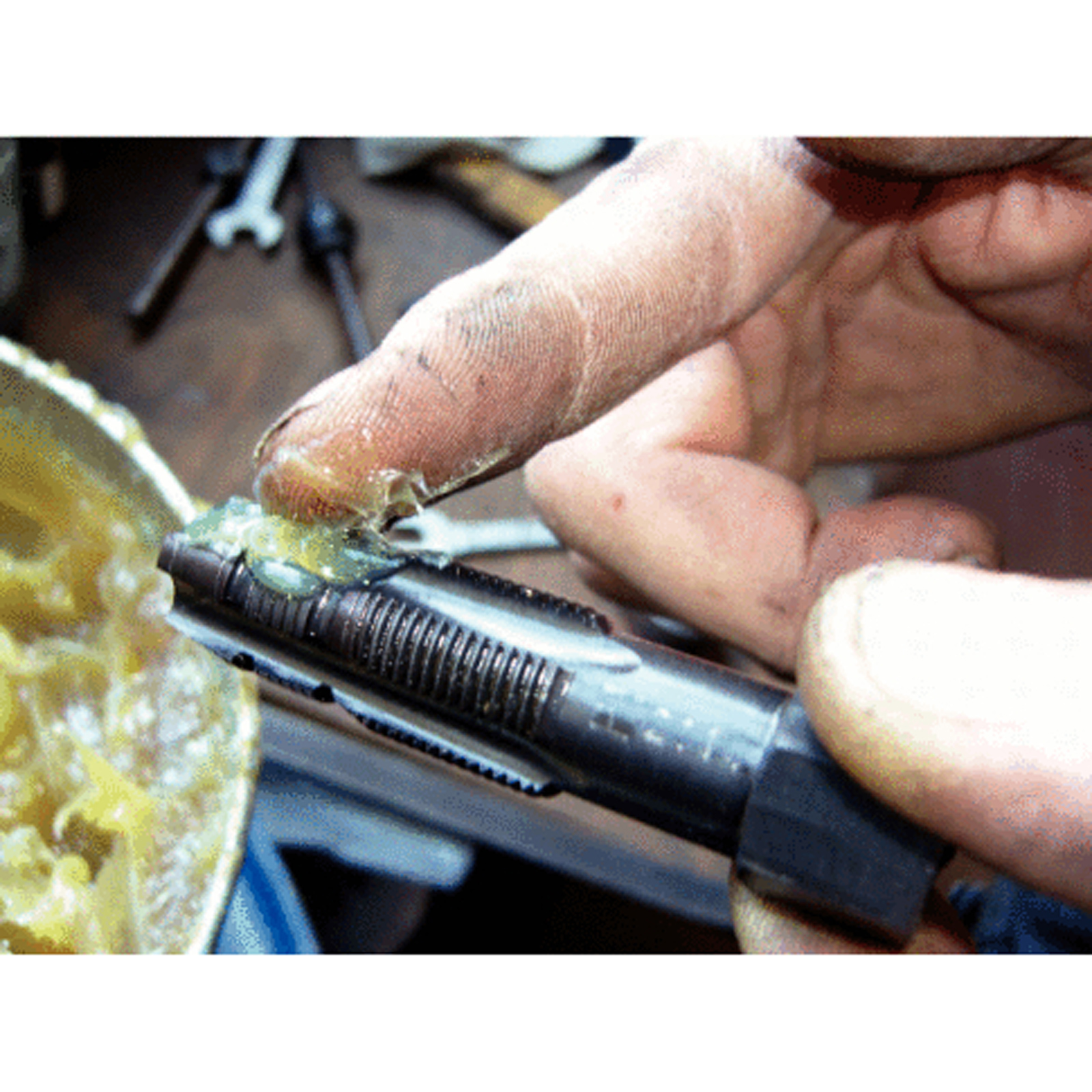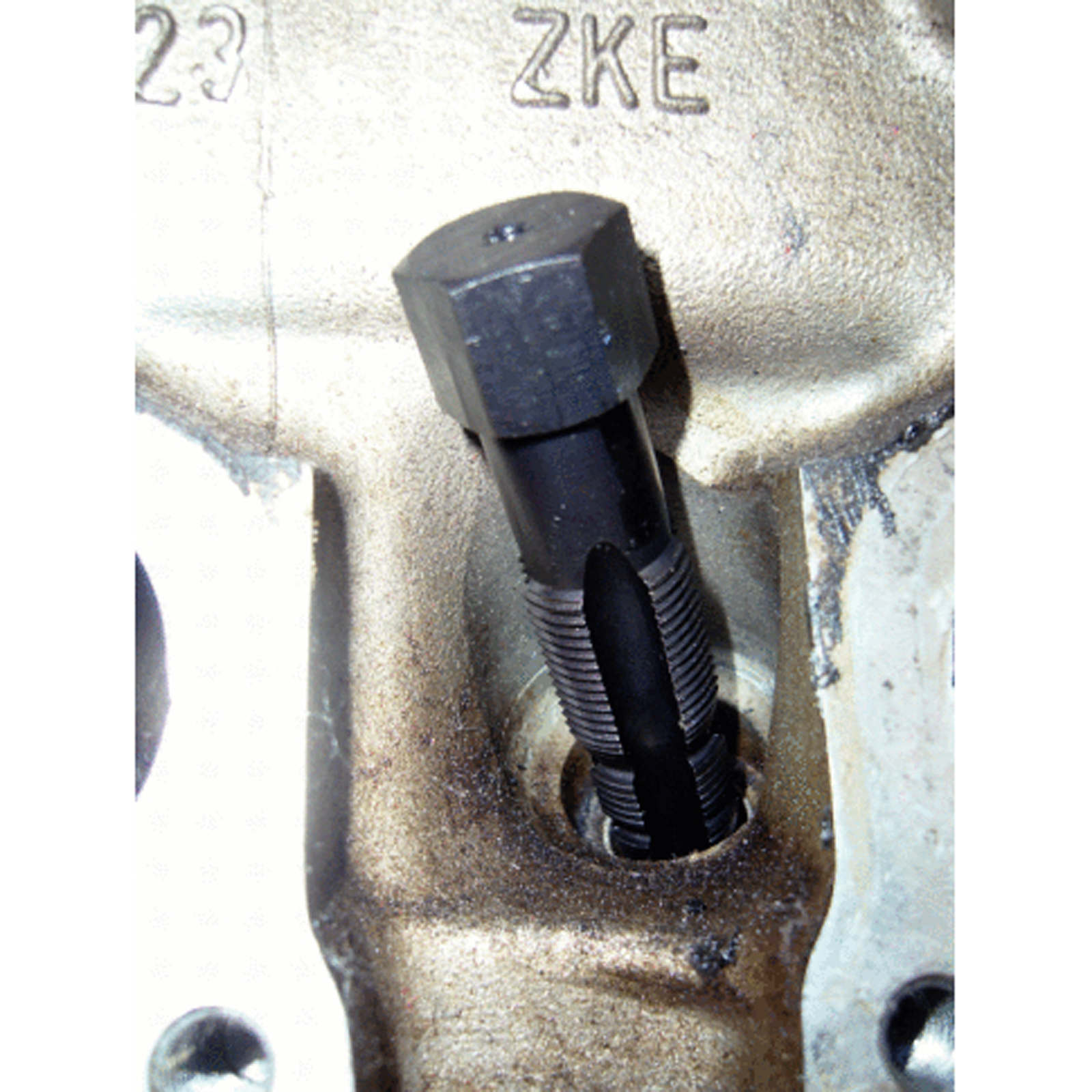 - Besonders zeit- und kostensparend, da die Reparatur ohne Demontage des Zylinderkopfes ausgeführt werden kann. Dank des speziellen Gewindebohrers wird das Ausräumen der alten Gewindereste und das Schneiden des neuen Gewindes in einem Arbeitsgang erledigt.
