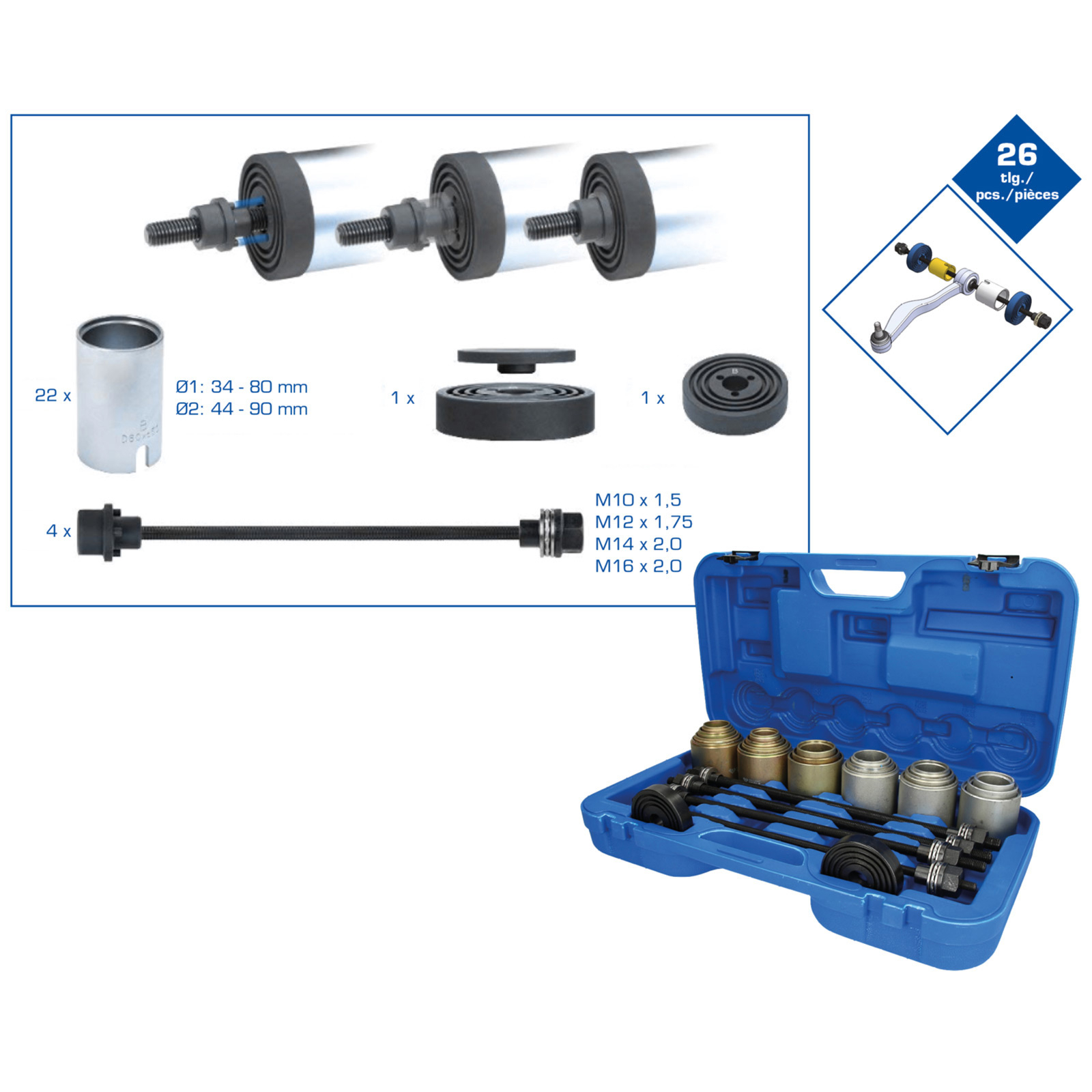 - umfangreicher Satz für schnelle und effektive Demontage und Montage von Radlagern und Fahrwerksbuchsen