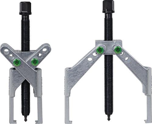verstellbar mit selbstsichernden Haltestiften zum individuellen Einstellen der Spannweite und Spanntiefe selbstspannend einfache Handhabung optimale Anpassung der Spindel an die Welle durch 2-seitige Spindelspitze (Kugel und Spitze) mit extrem schmalen Abzughaken Anwendung: zum Abziehen von Ritzeln, Lagern und ähnlichen Teilen bei engen Platzverhältnissen