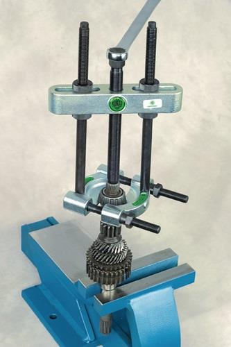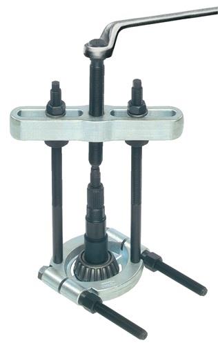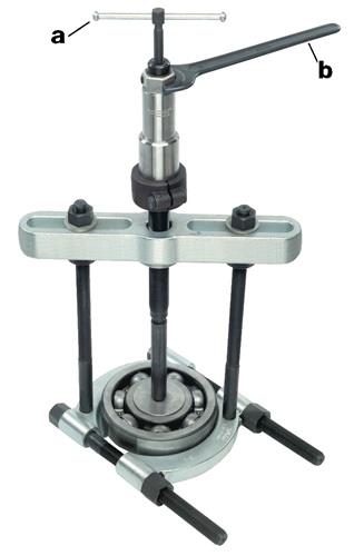 Anwendung: zum Abziehen von Kugellagern, Rollenlagern, Innenringen und anderen bündig aufsitzenden Teilen die scharfen Schneiden ermöglichen das Abziehen bündig aufliegender Teile, wo 2- und 3- armige Abzieher unanwendbar sind (Abb. 1) das Spannen der Trennbacken erfolgt durch gleichmäßiges Abziehen der Muttern auf den Seitenbolzen Arbeitsweise: das Abziehen erfolgt durch Anziehen der Spindel gegen das Wellenende (Abbildung 2 und 3), bei den größeren Abziehvorrichtungen ist auch hydraulische Arbeitsweise möglich Arbeitsweise mit Hydraulik (Abbildung 4): (Hydraulik gehört nicht zum Lieferumfang) mit dem Schlüssel (b) die Spindel der Hydraulik in das Gewinde der Traverse der Abziehvorrichtung schrauben bis sich das Druckstück fest gegen die Welle presst, dann durch Drehen der oberen Spindel (a) die Hydraulik in Tätigkeit setzen Achtung: die Abbildungen 2 und 3 zeigen die Trennvorrichtung in Kombination mit der Abziehvorrichtung Art.-Nr. 4157 490 000, 4157 490 001, 4157 490 002, 4157 490 003 (gehört nicht zum Lieferumfang) die Abbildung 4 zeigt die Trennvorrichtung in Kombination mit der Abziehvorrichtung Art.-Nr. 4157 490 000, 4157 490 001, 4157 490 002, 4157 490 003 und einer Hydraulikspindel (Abziehvorrichtung und Hydraulikspindel gehören nicht zum Lieferumfang) Hydraulikspindel bitte separat anfragen