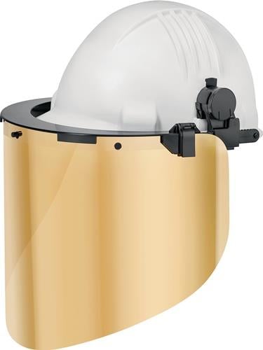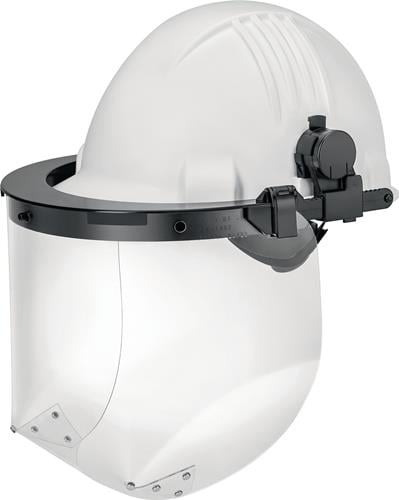 aus Polycarbonat · Befestigung am Helm mittels 30 mm Slots · passend für viele gängigen Industrieschutzhelme · die Schutzscheiben können mit einem 4-Punkt-Rastergelenk hochgeklappt werden · 240 x 250 x 70 mm · alle Rudolf Uhlen Standard-Schutzscheiben können an der Halterung befestigt werden Weitere technische Eigenschaften: · Gewicht ca.: 180g