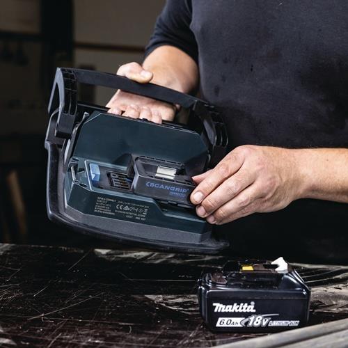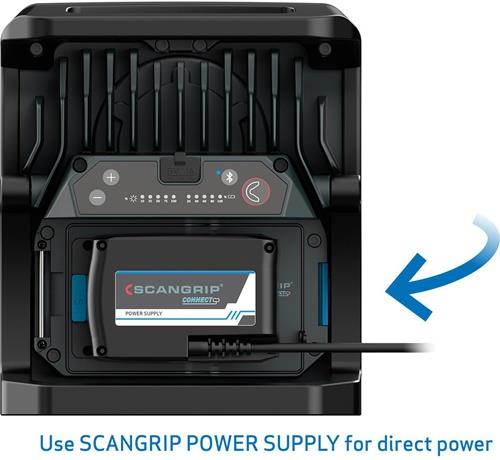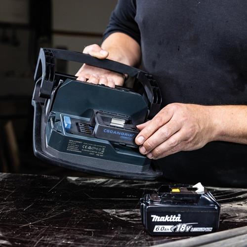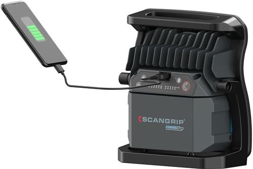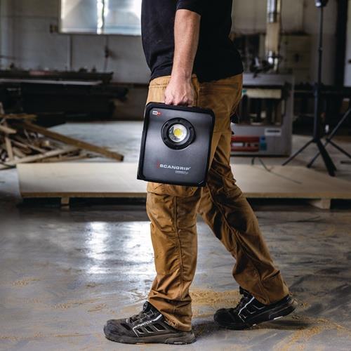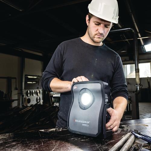 hocheffiziente E COB-LED-Arbeitsleuchte mit 4000 Lumen für 18-V-Akkupacks · extrem robuste akkubetriebene Arbeitsleuchte · Dimmfunktion · Anzeige für Akkustand und Lichtleistung · eingebaute Powerbank · Tragegriff und Stellfuß für flexible Ausrichtung und Direktmontage am SCANGRIP-Stativ · Schutzart IP65 Weitere technische Eigenschaften: · Abstrahlwinkel: 110° · prüfpflichtig: ja · Leuchtdauer: 1,5 - 14h