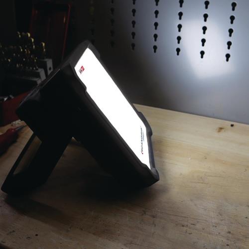 wasserdicht (IP54) · diffuses, blendfreies Arbeitslicht · einheitliche Lichtintensität und große Lichtstreuung · zwei Lichtstufen (50-100 %) · integrierter Handgriff und Stellfuß für Montage am SCANGRIP Stativ · robustes, schlagfestes Kunststoffgehäuse · die LEDs entwickeln keine Wärme und deshalb gibt es keine Brandgefahr Weitere technische Eigenschaften: · Abstrahlwinkel: 100° · prüfpflichtig: ja · Leuchtdauer: max. 4,5h
