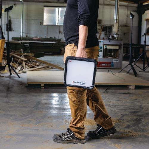 wasserdicht (IP54) · diffuses, blendfreies Arbeitslicht · einheitliche Lichtintensität und große Lichtstreuung · zwei Lichtstufen (50-100 %) · integrierter Handgriff und Stellfuß für Montage am SCANGRIP Stativ · robustes, schlagfestes Kunststoffgehäuse · die LEDs entwickeln keine Wärme und deshalb gibt es keine Brandgefahr Weitere technische Eigenschaften: · Abstrahlwinkel: 100° · prüfpflichtig: ja · Leuchtdauer: max. 4,5h