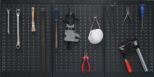 aus stabilem Stahlblech kratzfeste Pulverbeschichtung bestehend aus 3 Lochwandplatten á 40 cm mit Euro-Schlüssel-Lochung Hammerschlagsilber