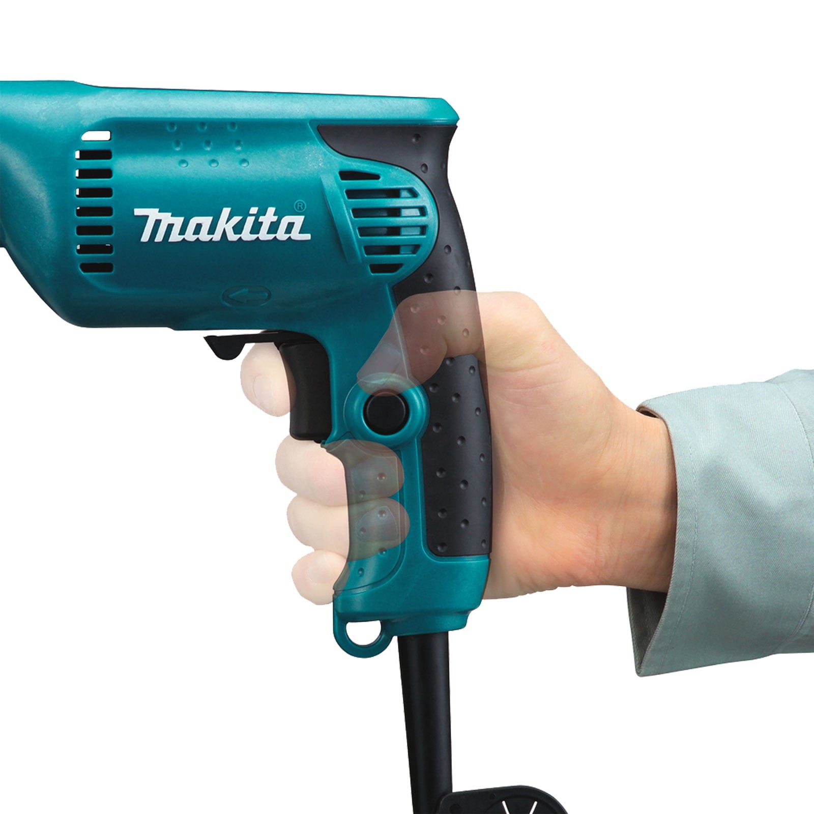 - ein kompakter 340 W Bohrer mit zwei Drehzahleinstellungen und variabler Drehzahlregelung zwischen 0-3.400 min-1