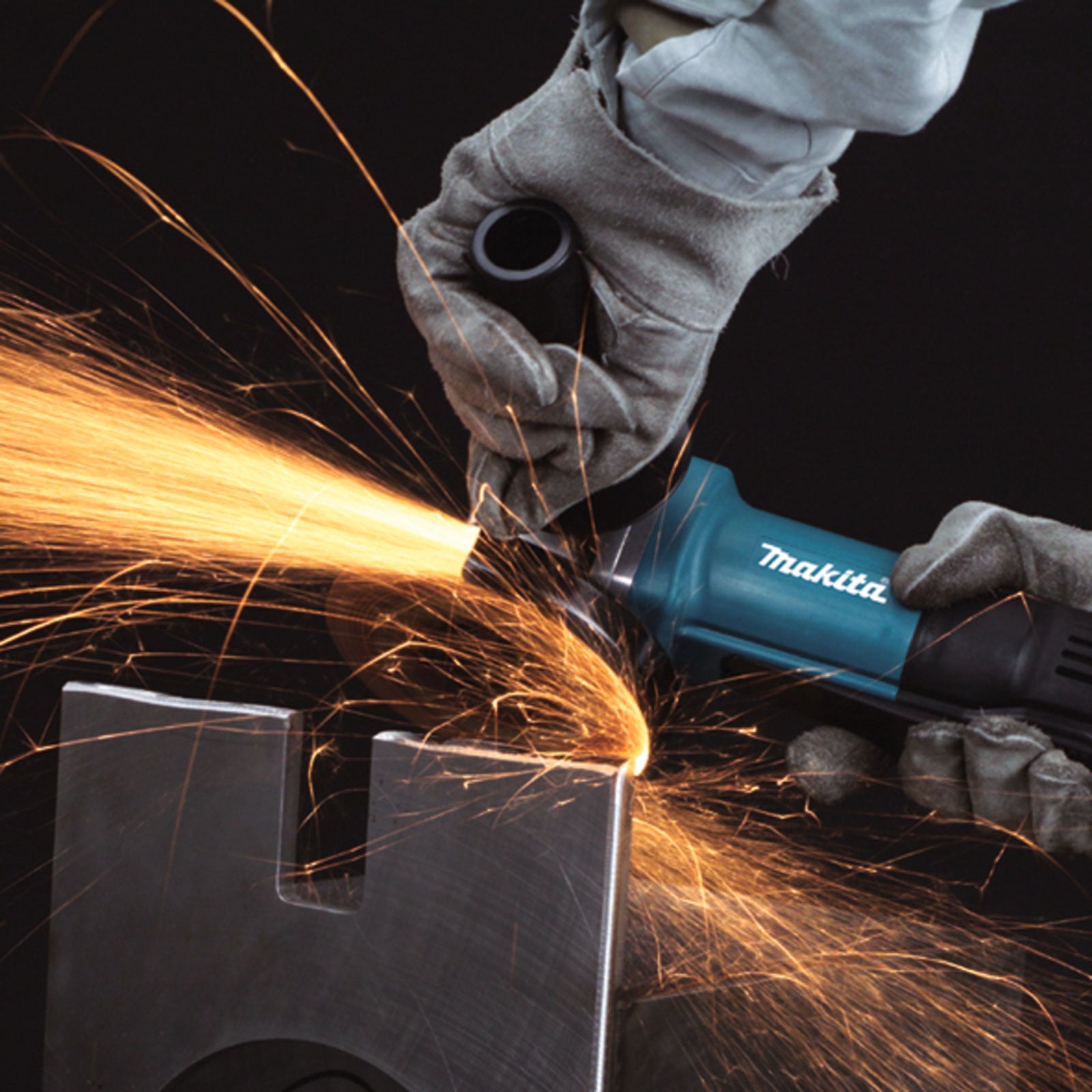 - Das Gerät weist ein gesintertes Winkelgetriebe und einen 840 W Motor auf, für Schleifscheiben bis 125 mm.
