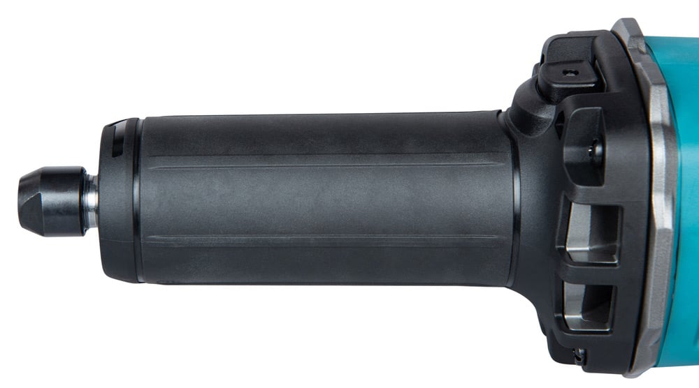 - Der abnehmbare Kunststoffschutz über dem Spindelgehäuse dient als Zusatzgriff und die abgerundete Spannmutter reduziert das Risiko die Oberfläche zu beschädigen.