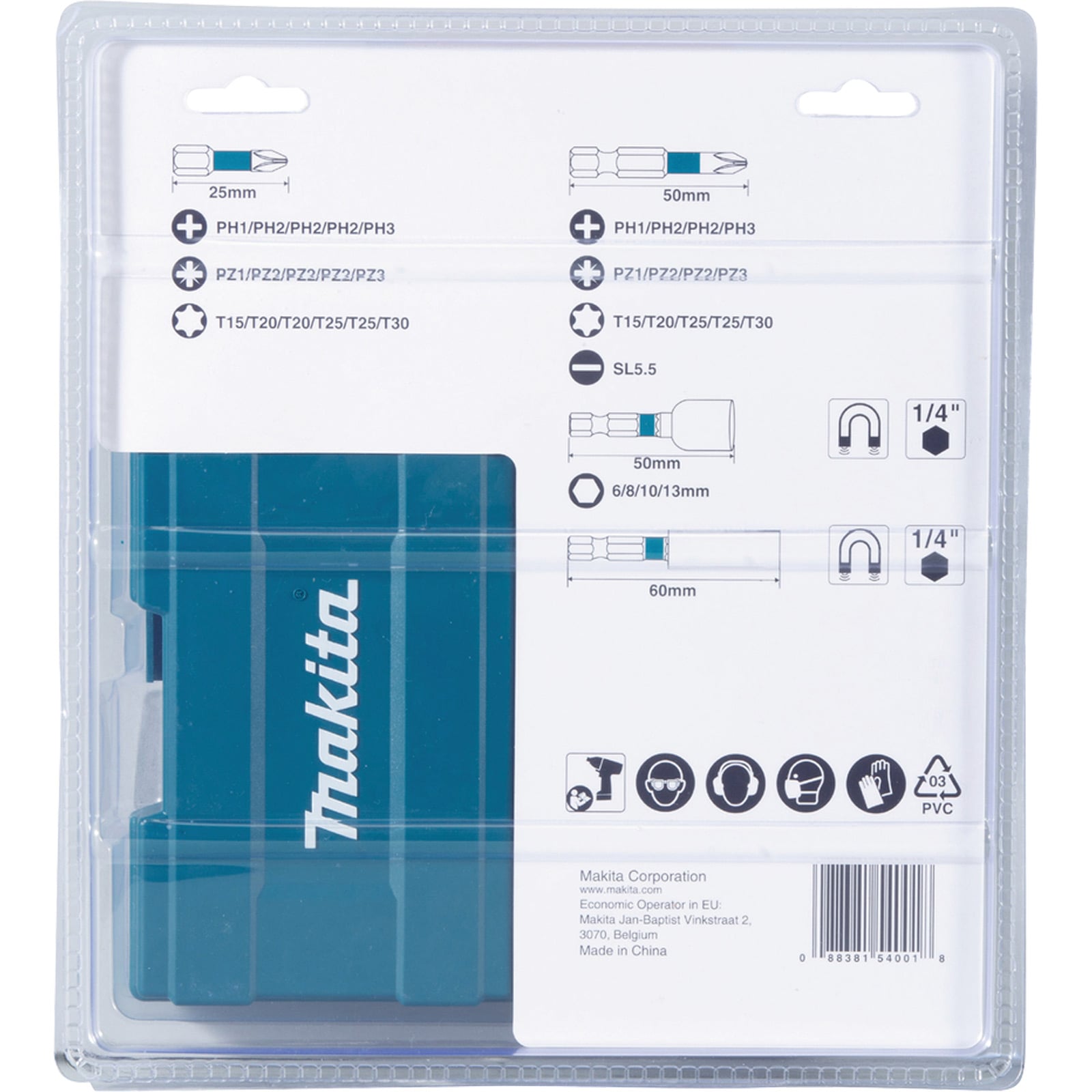- Makita Bits 50 mm (1xPH1, 2xPH2, 1xPH3, 1xPZ1, 2xPZ2, 1xPZ3, 1xT15, 1xT20, 2xT25, 1xT30, 1xSL0.8x5.5)