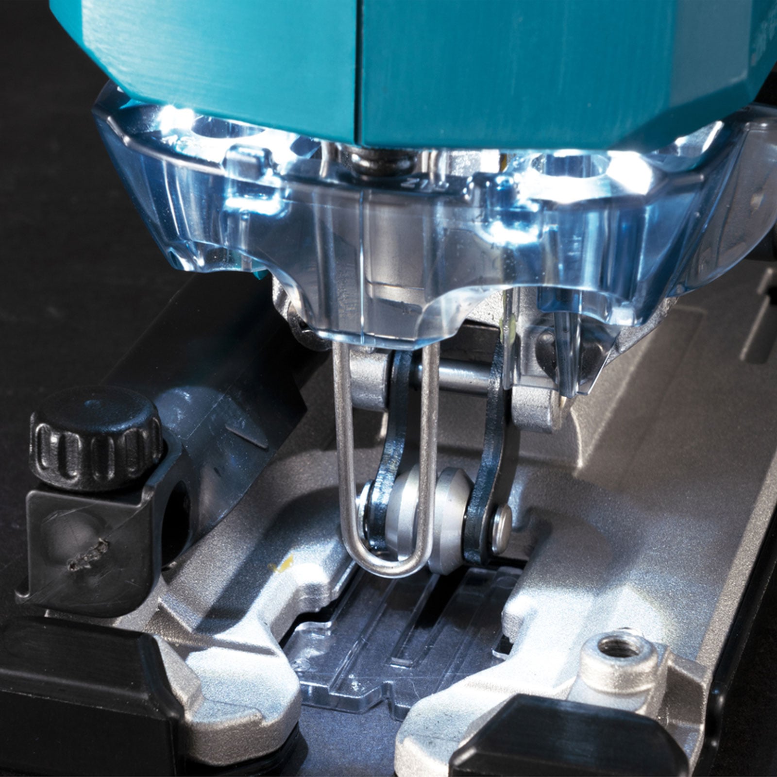 - leistungsfähige Akku-Pendelhubstichsäge mit dimmbarer LED-Beleuchtung und werkzeuglosem Sägeblattwechsel