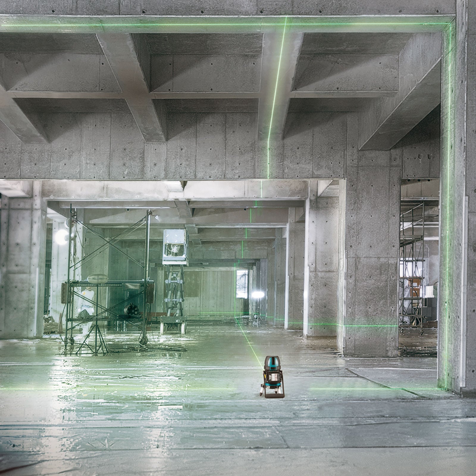 - leuchtstarke grüne Laserlinien, eine horizontale, drei vertikale