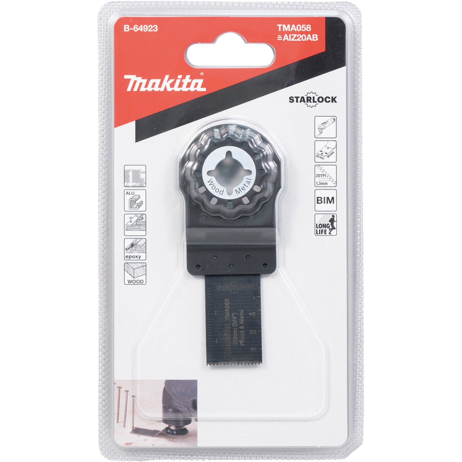 - Das Tauchsägeblatt TMA058 verfügt über ein 20 mm breites und 30 mm tiefes Schneidblatt und hat eine besonders lange Lebensdauer.