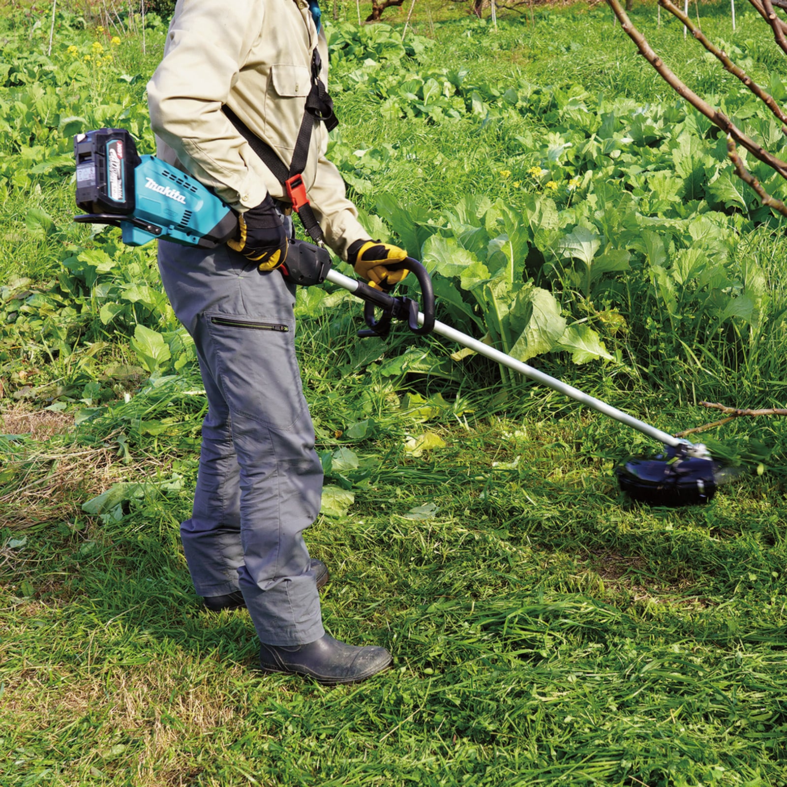 - Leise und besonders durchzugsstarke Akku-Sense mit Rundgriff für Ausputzarbeiten und Arbeiten auf großen Flächen