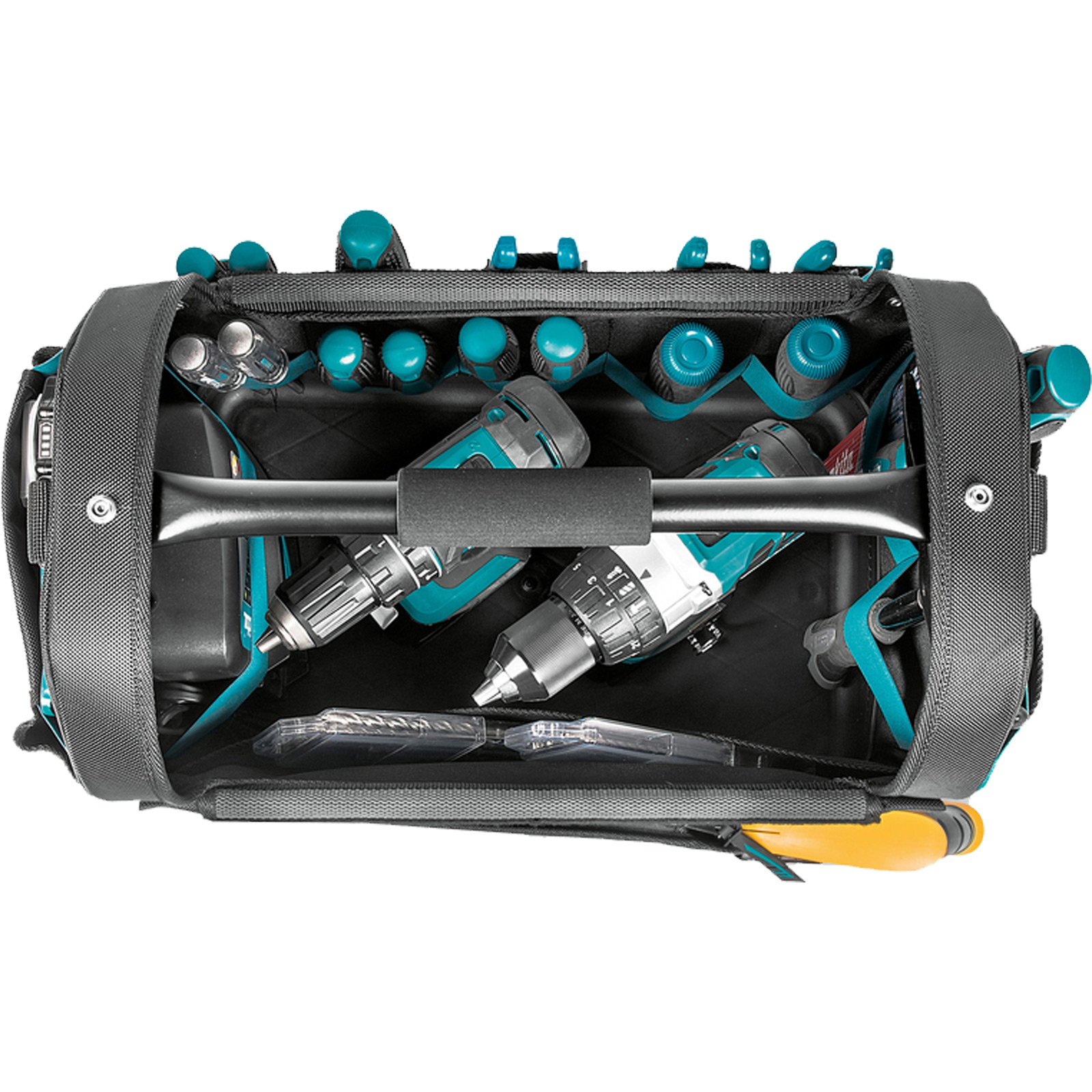 - Die Werkzeugtasche verfügt über neun Außenfächer in verschiedenen Größen, acht elastischen Bändern für Handwerkzeuge und einem großen Fach in der Mitte der Tasche für Maschinen.
