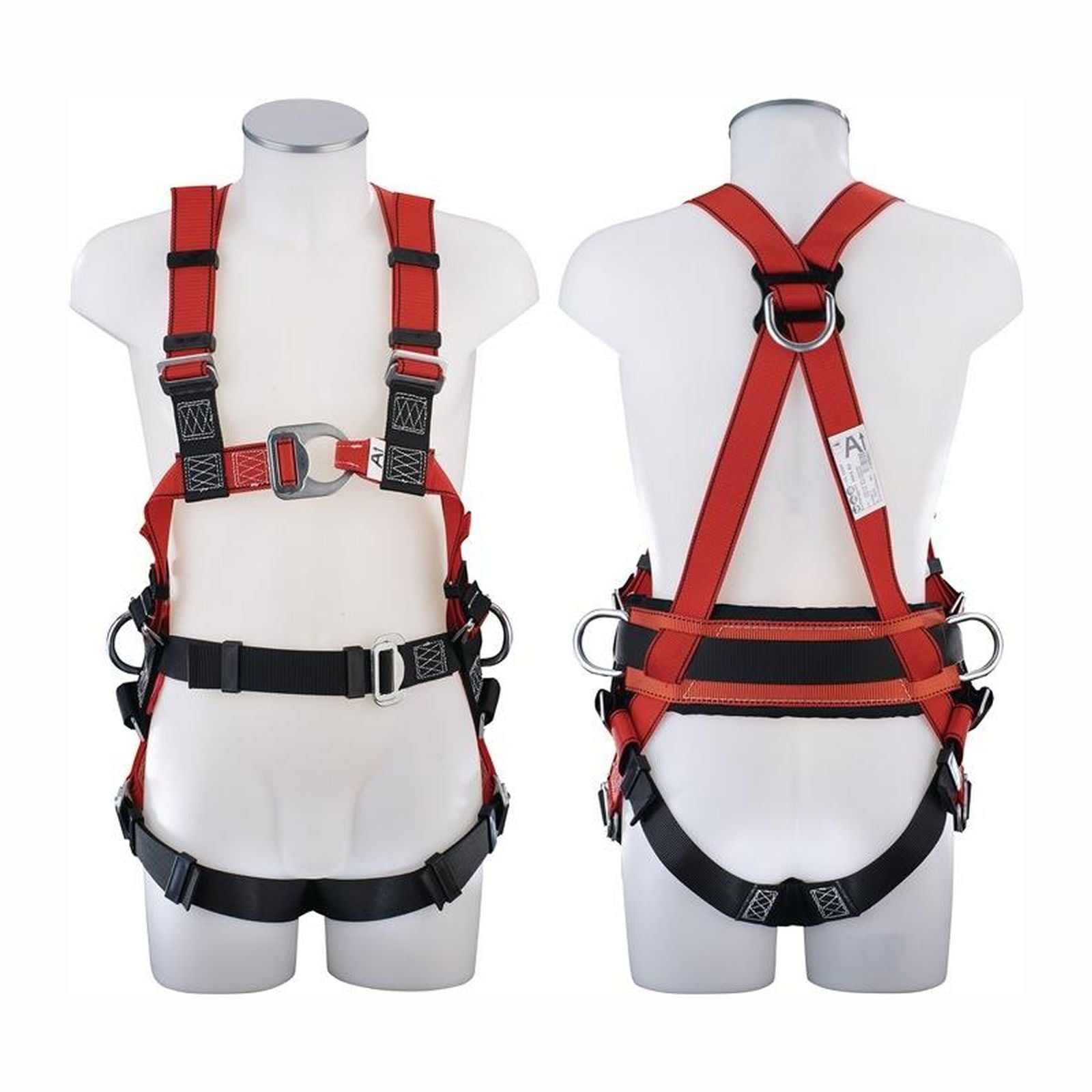 EN 361, EN 358 mit einem 100/140 mm gepolsterten Rückenteil zwei Auffangösen (vorn und hinten), sowie zwei seitlichen Positionierungsösen, durch die der Anwender seinen Arbeitsplatz positionieren kann Verstellungsmöglichkeiten der Schultergurte sowie der Beingurte (mit Durchsteckrahmen) und des Gesäßgurtes Bauchgurt mit Durchsteckrahmen
