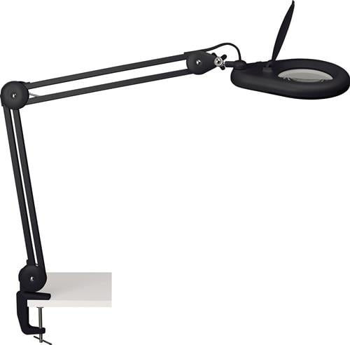 Metall robuster Metallarm drehbar, neigbar runder Kopf Glaslinse 127 mm (5″) mit Abdeckung 3 Dioptrien mit 56 SMD LED`s tageslichtweiß (6.500 Kelvin) gewichteter Energieverbrauch 8 kWh/1000 h Betriebsspannung 220-240 V Lieferung inkl. Leuchtmittel (56 SMD-LED`s) diese Leuchte enthält eingebaute LED-Lampen die Lampen können nicht ausgetauscht werden Tischklemme - Armlänge unten/oben 410 mm - Höhe 410 mm - höhenverstellbar bis max. 750 mm Standfuß - Armlänge unten/oben 310 mm - Höhe 400 mm - höhenverstellbar bis max. 660 mm Ausführung: Standfuß Farbe: schwarz Ausstattung: mit Abdeckung, runder Kopf Energieeffizienzklasse: A++ bis E Vergrößerung: 3 Dioptrien Durchmesser: 127 mm (5 ″) mm Linse: Glaslinse