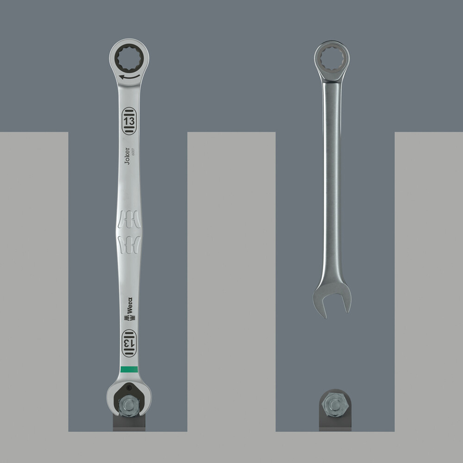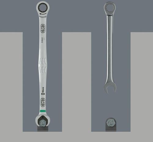 einzigartige Kombination aus Maul- und Ring-Ratschenmechanik in langer Ausführung · langer Hebel ermöglicht höhere Kraftübertragung · bessere Zugänglichkeit bei tiefliegenden Verschraubungen · kein Abrutschen durch Endanschlag · mit praktischer Haltefunktion durch Metallplatte im Maul Weitere technische Eigenschaften: · Verpackung: Tasche · Schlüsselweiten: 8-19mm · Anti-Slip: ja · Endanschlag: ja · Extra long Joker: ja · Haltefunktion: ja · High Torque Ratchet Wrench: ja · Rückholwinkel: ja · Take it easy Maul-Ringratschen-Schlüssel Joker: ja
