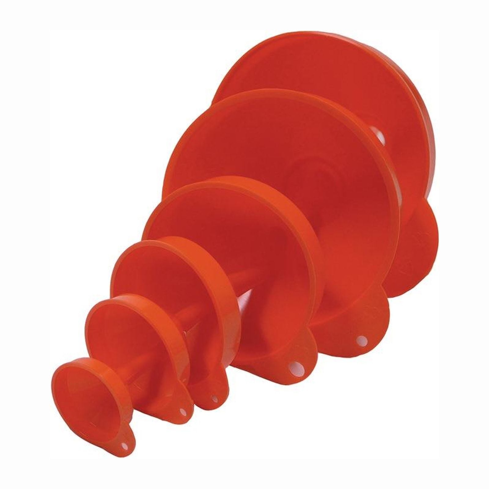 HD-PE orange 6-teilig lebensmittelecht (LFGB konform) mit Entlüftungsstegen für schnellen Durchlauf mit stabilem Laschengriff und Aufhängung bruchfeste, stabile Ausführung kraftstoff-, öl- und säurebeständig Ø: 50, 70, 90, 115, 150, 160 mm Marke: MAX4CAR Material: HD-PE