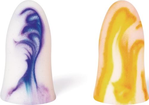 Bunt marmorierte Schaumstoffstöpsel zum Einsetzen in den Gehörgang.