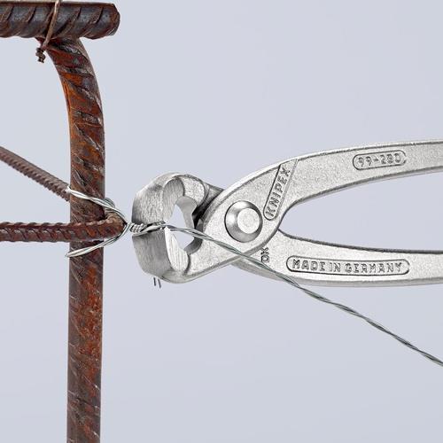 (Rabitz- oder Flechterzange) · zum Verdrillen und Schneiden von Bindedraht von der Rolle in einem Arbeitsgang · Schneiden zusätzlich gehärtet, Schneidenhärte ca. 61 HRC · Spezial-Werkzeugstahl in Sondergüte, geschmiedet, mehrstufig ölgehärtet Zange glanzverzinkt